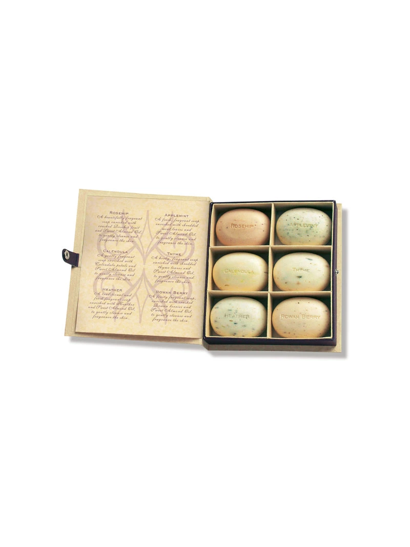Die edle Schmuckkassette in Sammelbuchform enthält sechs verschiedene Seifenstücke à 50 Gramm (Hagebutte, Apfelminze, Ringelblume, Thymian, Erika und Eberesche) und ist mit Erläuterungen versehen. Ein exquisites Geschenk! Made in England.
