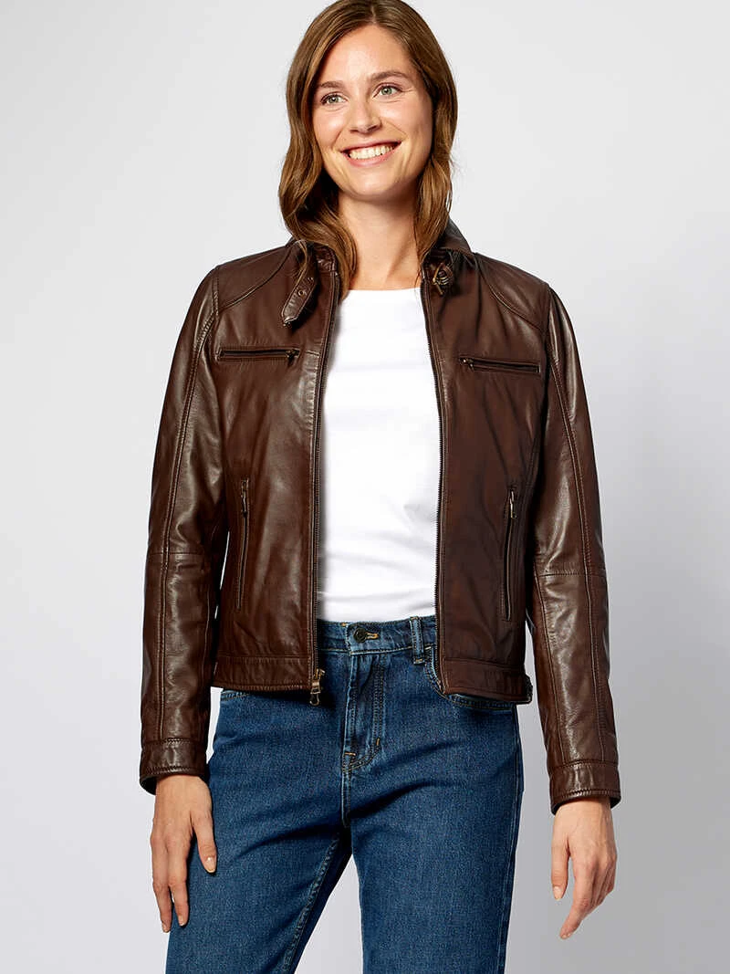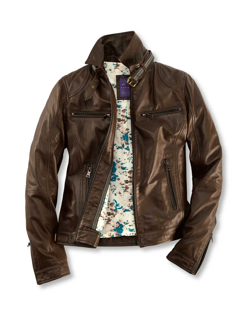 Butterweiches Lammnappa in Dark Chocolate macht diese Lederjacke im angesagten Bikerstil zum umwerfenden Hingucker! Markante Metall-Reißverschlüsse in Altmessing vorne, an den vier Taschen und Ärmeln sind an Coolness kaum zu übertreffen. Der Clou ist ein Extra-Kragen zum Einzippen, der speziell fürs Cabriofahren gedacht ist, so kann man je nach Laune zwischen Doppelkragen und kleinem Stehkragen wählen. Ein Riegel am Kragensteg, seitliche Schnallen mit Riegeln und das geblümte Innenfutter im Vintagestyle sowie eine Innentasche runden das Design wunderschön ab. Schlank taillierte Passform (Modern Fit). Länge ca. 58 cm. Farbe: Dark Chocolate. Original Beaver’s.