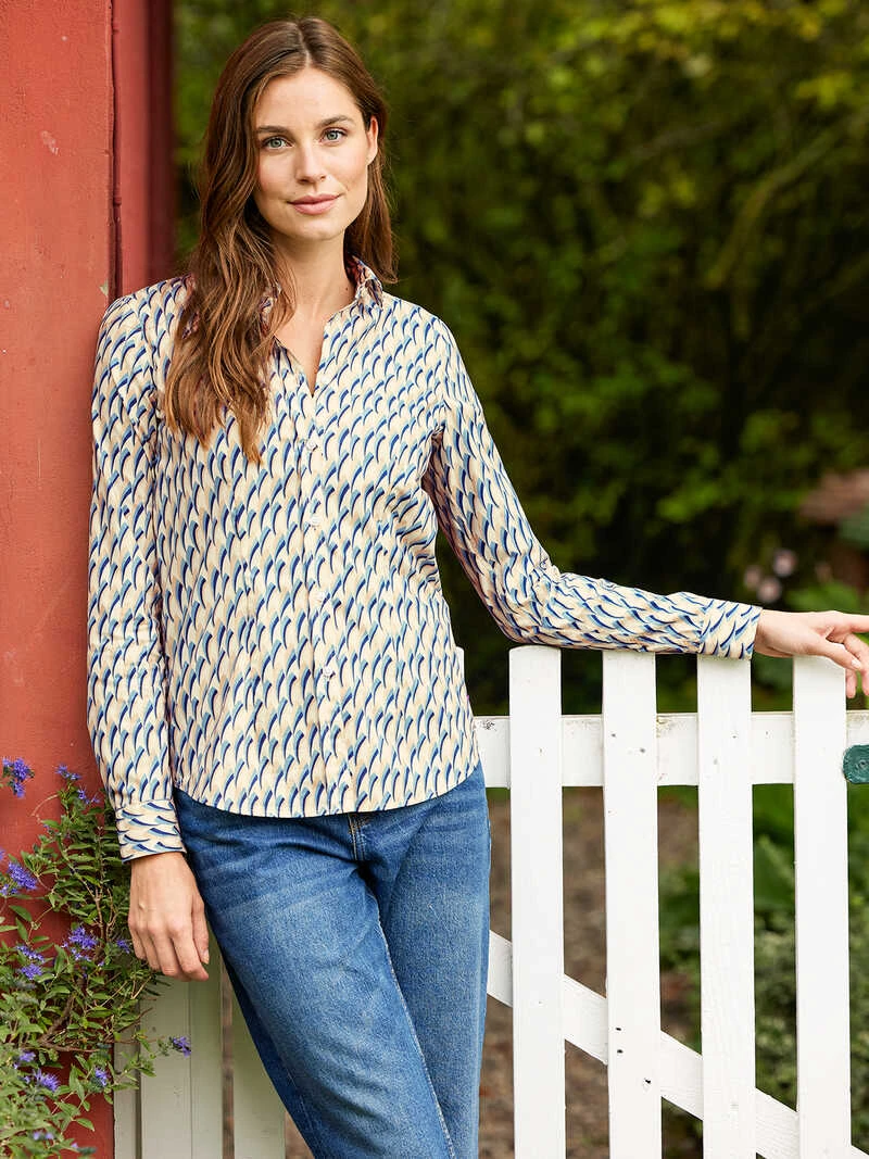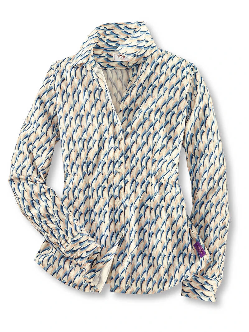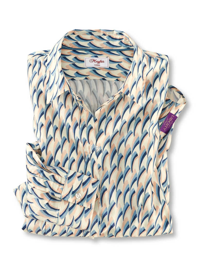 Diesmal hat unsere beliebte Liberty-Bluse einen ganz neuen Style bekommen! Statt des charakteristischen Blütenmusters, gab es einen jungen, grafischen Druck aus den weltbekannten Archiven. Ein sehr gelungenes Muster von »Liberty of London« in pastelligen Tönen, wie Rauchblau und Rosé auf dem ecrufarbenen Fond. Herrlich leicht und kühl fühlt sich das innovative Papertouch-Gewebe an. Die glatte Haptik ist vor allem im Sommer ideal. Mit aufgesetzter Knopfleiste, Manschetten, gerundetem Saum und Knöpfen in Perlmuttoptik. Zur Jeans sowieso, aber auch zur hellen Chino ist diese Bluse ein absoluter Hingucker! Leicht taillierte Passform (Regular Fit). Länge ca. 67 cm. Farbe: Ecru-Rauchblau-Rosé. Original Mayfair.