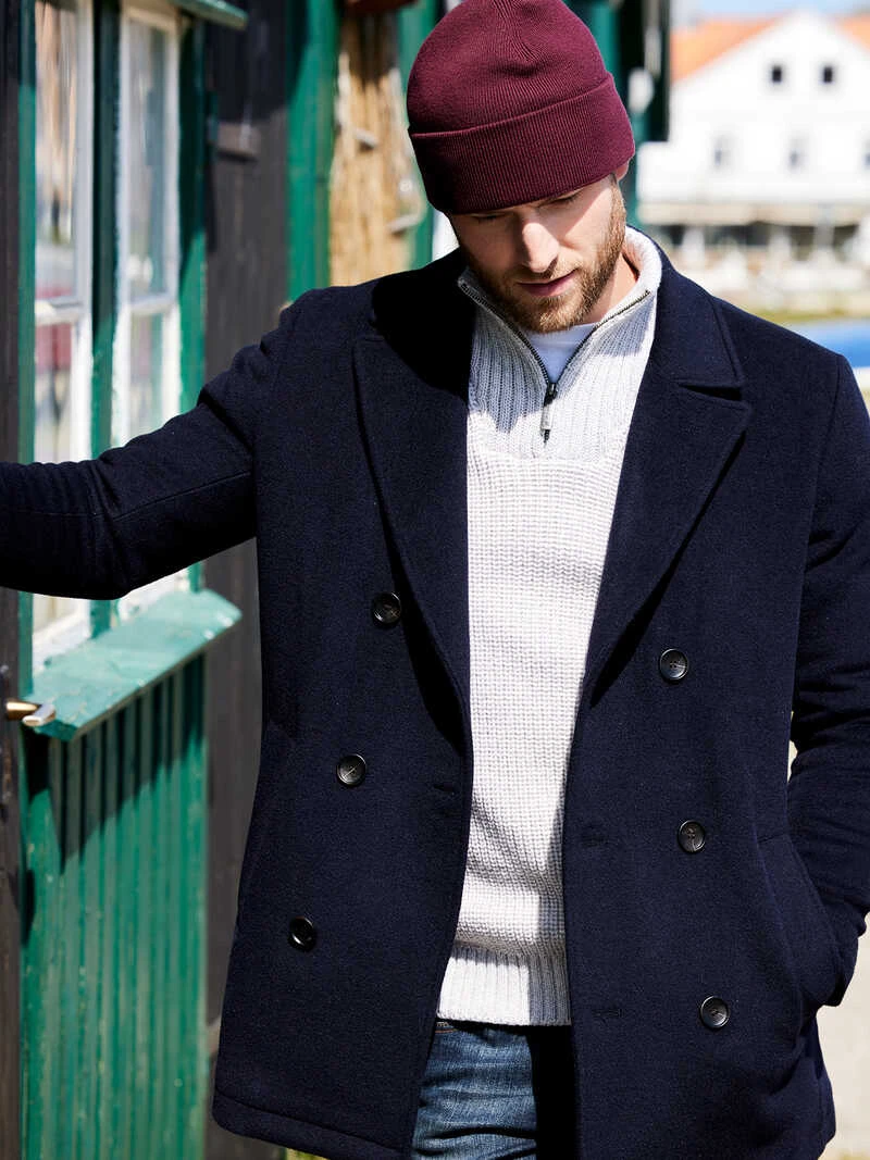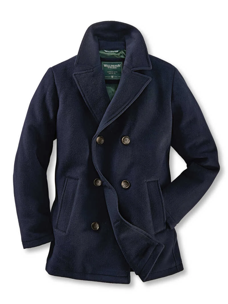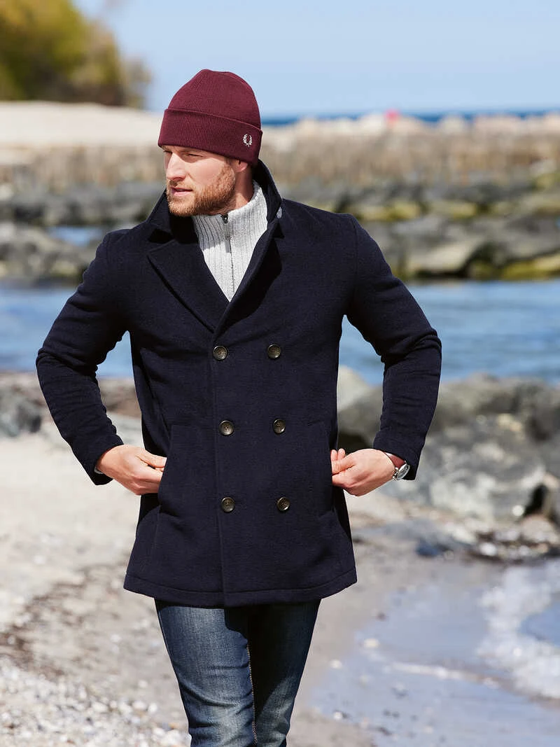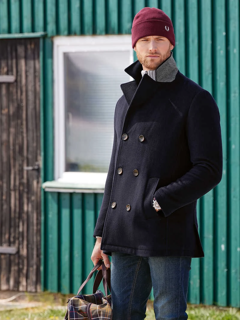 Einer der populärsten Klassiker in der Männermode ist die Cabanjacke (engl.: ‚Pea Coat‘)! Sie wurde einst von den Seemännern der Marine getragen, daher stammt der dezente Uniform-Stil des Kurzmantels, den er bis heute behalten hat. Bei einem echten ‚Pea Coat‘ dürfen diese charakteristischen Elemente natürlich nicht fehlen: Zweireihig geknöpft, Reverskragen und seitliche Schubtaschen. Das dunkelblaue Schurwollgewebe mit Kaschmir und das leichte Thermofutter halten gut warm. Eine individuelle Jacke zu einem wirklich guten Preis! Mit zwei Innentaschen und zwei Schlitzen auf der Rückseite. Normale Passform (Regular Fit). Länge ca. 83 cm. Farbe: Navy. Original Wellington of Bilmore.