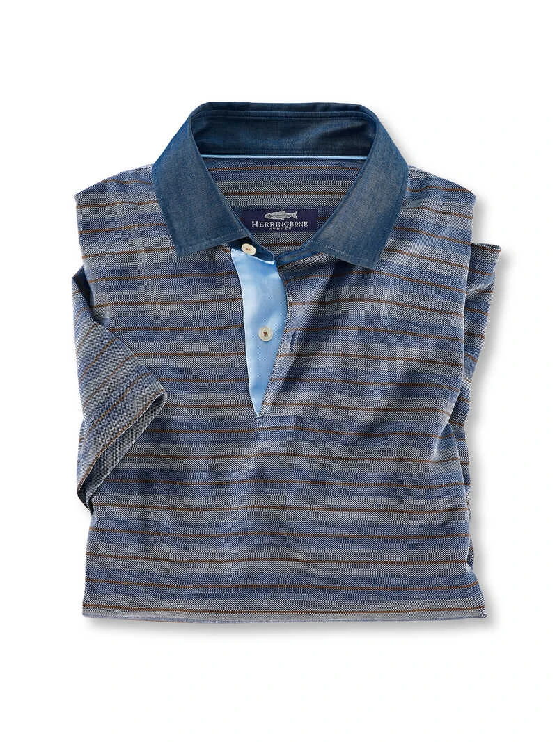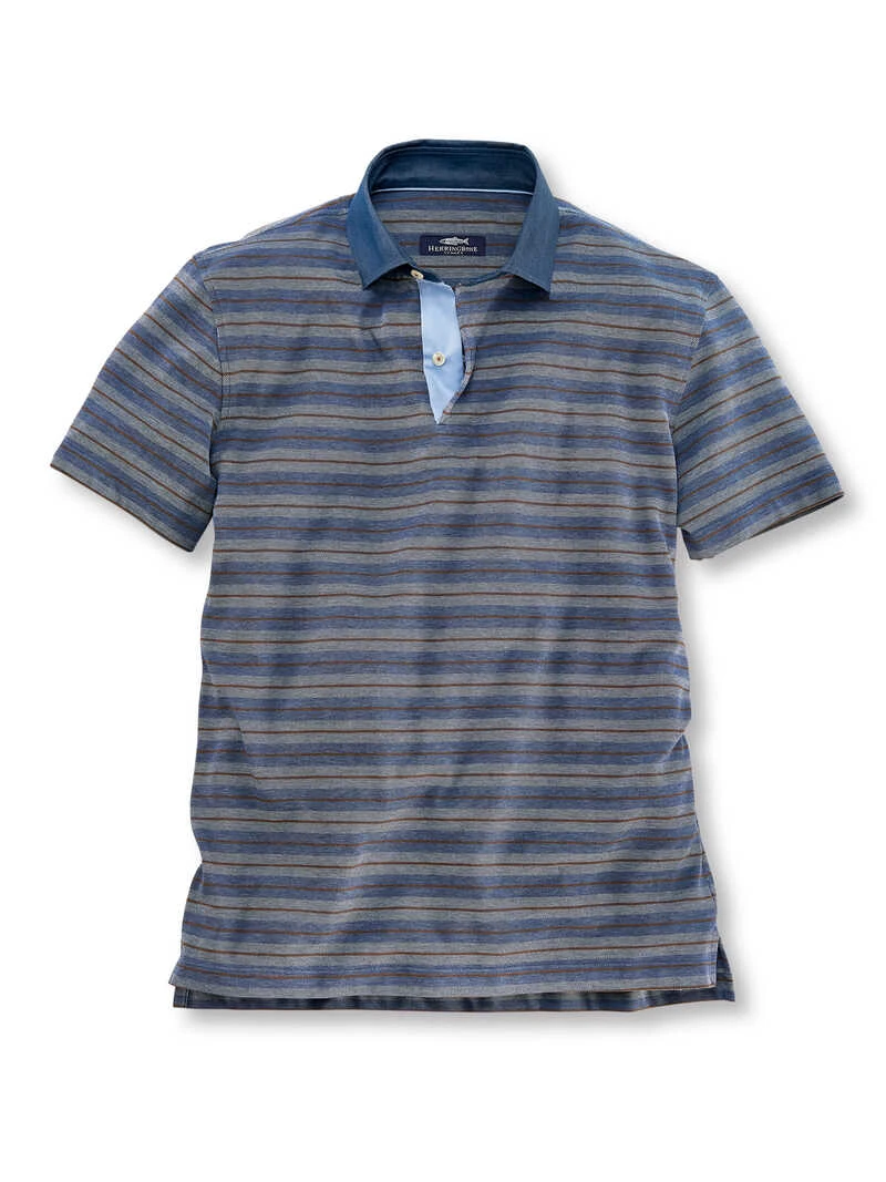 Sportiv und edel zugleich – ein Poloshirt, gemacht, um zu bleiben! In begehrtem Blau mit Hellgrau und einem Hauch Bronze besticht das Streifendessin des sehr feinen und angenehm weichen Baumwoll-Piqués. Ein echter Blickfang ist der Hemdkragen aus blauem Chambray, einem luftig-glatten Baumwollstoff, der durch das Weben verschiedener Garne eine Jeans ähnliche Optik erhält. Das gleiche Gewebe findet sich auch an der unteren Knopfleiste, allerdings in Hellblau als Kontrast. Mit zwei Seitenschlitzen; Ärmel und Saum ohne Bündchen. Normale Passform (Regular Fit). Länge ca. 74 cm. Farbe: Blau-Grau. Original Herringbone.