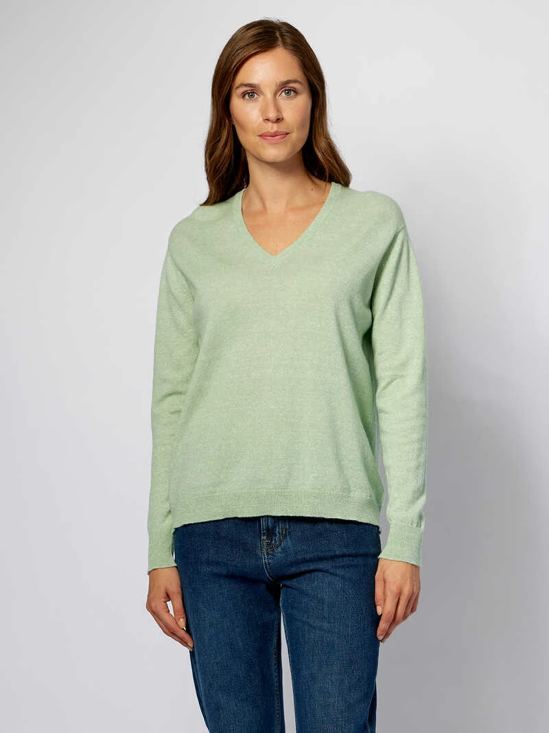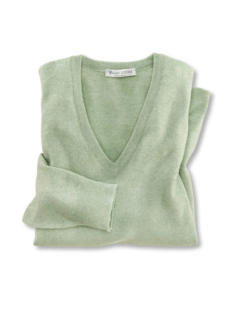 Eine seltene, geniale Luxusmischung gepaart mit einem unschlagbar schmeichelhaften, sommerlichen Mint-Melange – dieser Pullover trägt eindeutig die Handschrift des schottischen Stricklabels William Lockie! Bereits 1874 gegründet, stellt das Unternehmen solch einzigartige Stücke her. Hier mit einer besonders erstklassigen Sommermischung aus edlem, herrlich softem Kaschmir und luftig-kühlendem Leinen. In lässig weiterem Schnitt mit leicht überschnittener Schulter, schmeichelndem V-Ausschnitt und Rippbündchen an Ärmeln und Saum. Weitere Passform (Regular Fit). Länge ca. 65 cm. Farbe: Salbei-Melange. Original William Lockie.