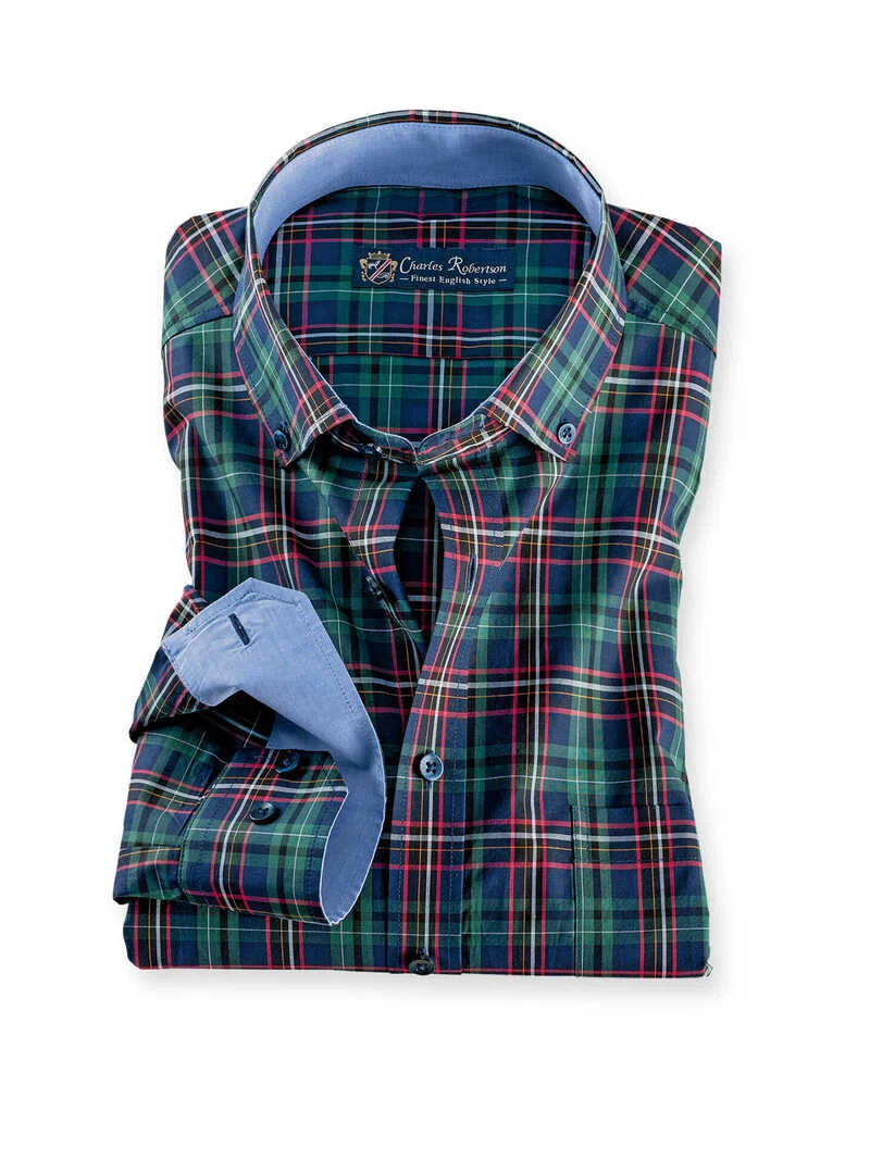 Bei diesem Hemd müssen Sie nicht mehr lange überlegen, was Sie anziehen, denn es passt fast immer! Das Schottenkaro steht nicht nur für den perfekten British Style, sondern sieht auch unverschämt gut zur Jeans aus. Das feine, dünne Popelinegewebe ist aus bester Baumwollqualität, bügelleicht ausgerüstet und gerade an warmen Tagen toll zu tragen! Ein besonderer Blickfang sind die hellblauen Stoffbesätze im Kragen und an den Manschetten. Mit ‚Button Down‘-Kragen, verstellbaren Manschetten, Brusttasche und aufgesetzter Knopfleiste. Bequeme Passform (Comfort Fit). Farbe: Blau-Grün kariert. Original Charles Robertson.
