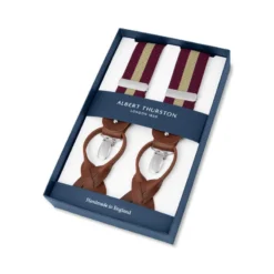 Das Spitzenmodell der Firma Albert Thurston, seit ihrer Gründung 1820 der weltweit älteste Hersteller von Hosenträgern, lässt sich variabel entweder mit echten Lederlaschen oder mit Clips an jeder Hose befestigen. Die elastischen, ca. 3,5 cm breiten Bänder sind längenverstellbar. Metallspangen und Clips sind aus silberfarbenem Stahl. Das klassische Streifendessin passt zu vielen Hemden. Lieferung im Geschenkkarton, zusätzlich mit 6 Knöpfen, falls Sie eine Hose speziell ausrüsten möchten. Original Albert Thurston. Made in England.