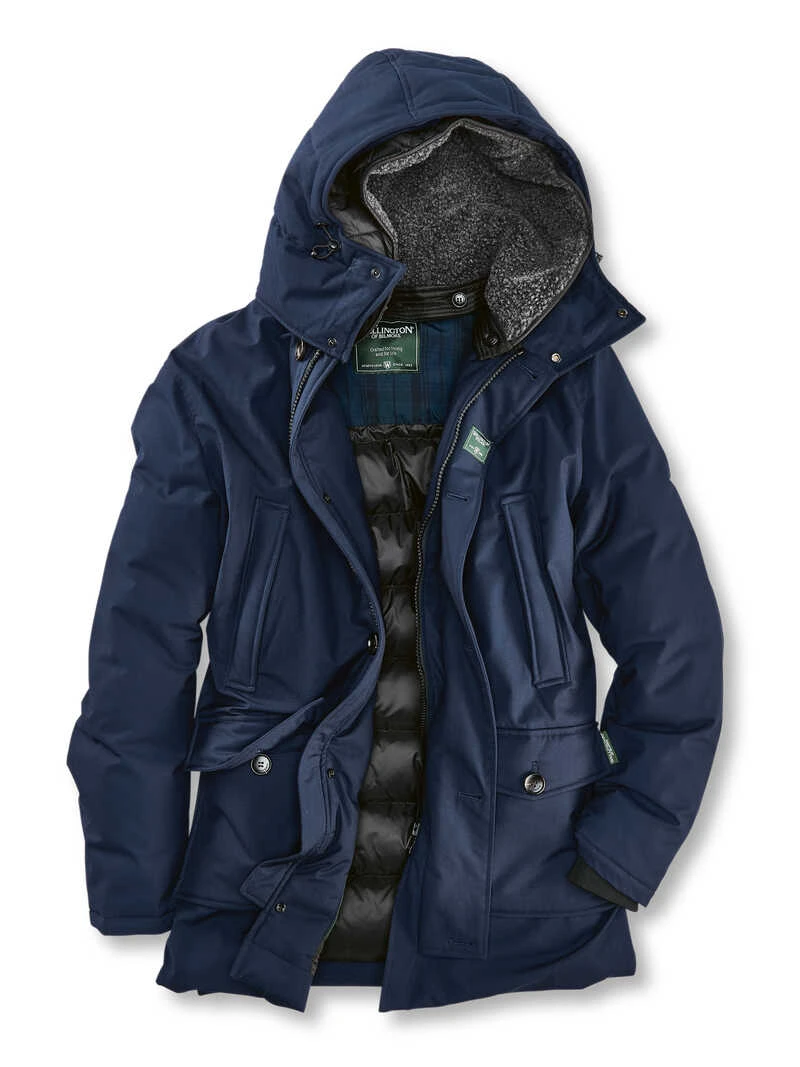 Dieser Parka bietet so ziemlich alles, was man(n) sich an eiskalten Tagen wünscht! Gefüttert ist er mit echten Daunen, die wärmen zuverlässig, sind schön leicht und atmungsaktiv. Selbst Graupelschauer prallen einfach an ihm ab, denn sein Gewebe ist wasserdicht. Die abnehmbare, warme Kapuze schützt bei Wind und Wetter und der Clou: Das kuschelige Teddyfell ist ausknöpfbar. Um alles Wichtige mitzunehmen, gibt’s viele Taschen: zwei aufgesetzte und zwei Schubtaschen und innen drei verschließbare. Der hoch zuschließende Kragen, warme Strickbündchen in den Ärmeln als auch der Zipper und die Knopfleiste halten die Wärme am Körper. Ein richtiges Multitalent für den Winter zu einem echt guten Preis! Mit regulierbarer Taille sowie Innentasche mit Reißverschluss. Normale Form (Regular Fit). Länge ca. 90 cm. Farbe: Navy. Original Wellington of Bilmore.