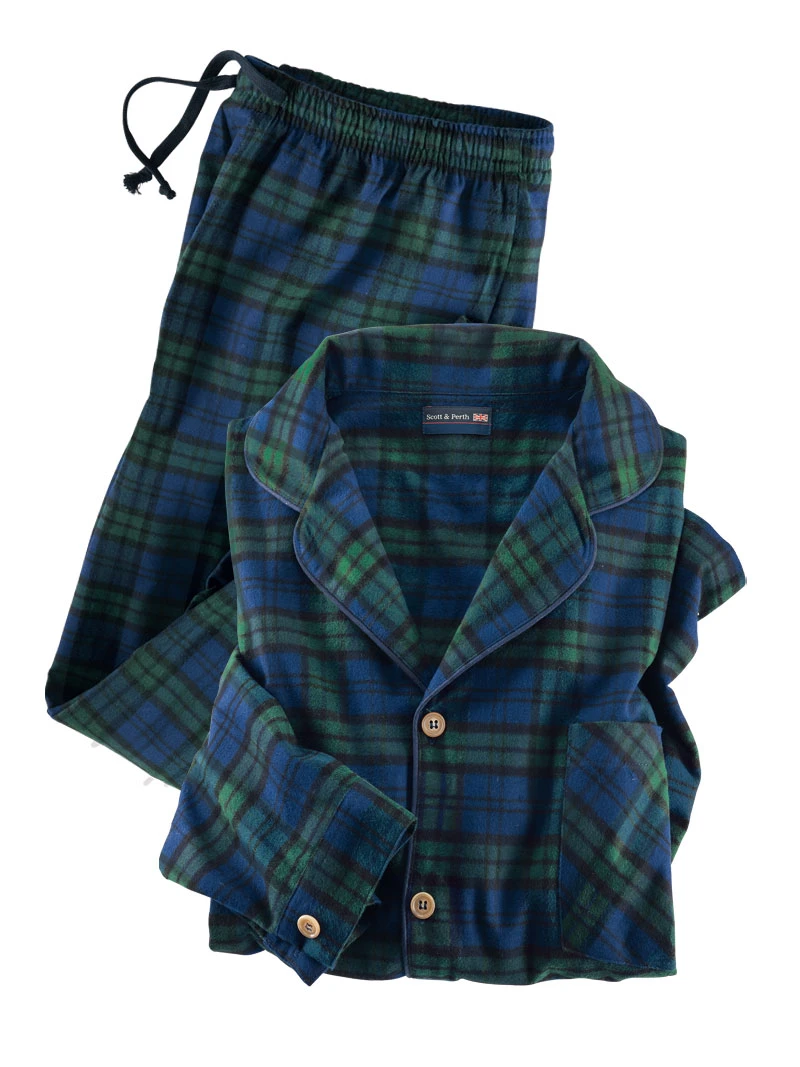 Typisch englisches Country Feeling erleben Sie in diesen herrlich warmen, weichen Nachthemden (Nightshirts) und Schlafanzügen (Pyjamas), die Scott & Perth aus angenehm softem Flanellgewebe (reine Baumwolle) herstellt. Nightshirt und Pyjama bieten wir in unterschiedlichen Dessins an: In ‚Old Times‘-Dessin (blau/weiß gestreift), im rot-karierten ‚Royal Stewart‘-Tartan sowie im blau-grünen ‚Black Watch‘-Tartan.