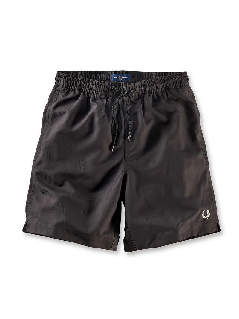 Nur zum Baden ist diese Badeshorts von Fred Perry fast zu schade! Ganz klassisch in Schwarz, besticht diese Shorts mit kleinen Akzenten, wie dem Nylon-Dobby. Diese Webart verleiht dem Stoff besondere Struktureffekte. Fred Perrys berühmter Lorbeerkranz schmückt kontrastfarbig den linken Hosensaum; superbequem wird es mit dem elastischen Bund inklusive Kordelzug. Die zwei praktischen Nahttaschen besitzen ein Meshfutter und die aufgesetzte Gesäßtasche einen kleinen Klettverschluss. Kombiniert mit einem Shirt, Flip-Flops oder Bootsschuhen, wird ein lässig-sportiver Look draus. Mit Mesh-Innenhose. Normale Passform (Regular Fit). Farbe: Schwarz. Original Fred Perry.