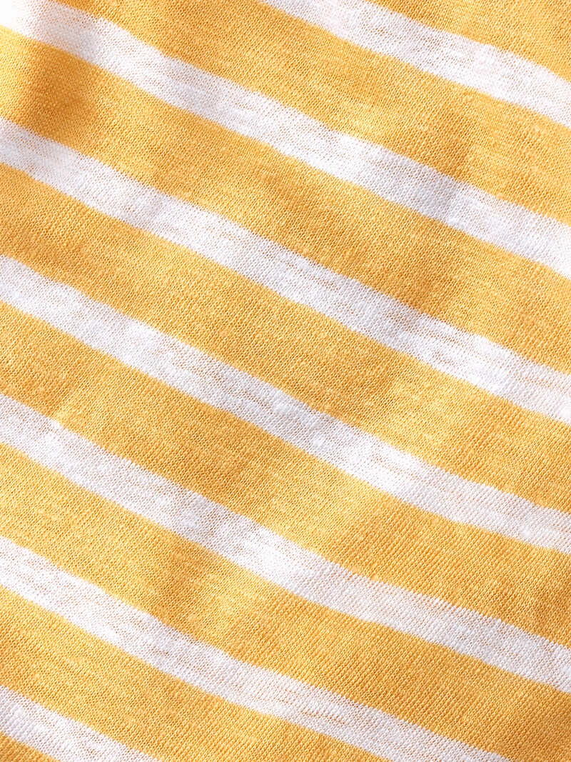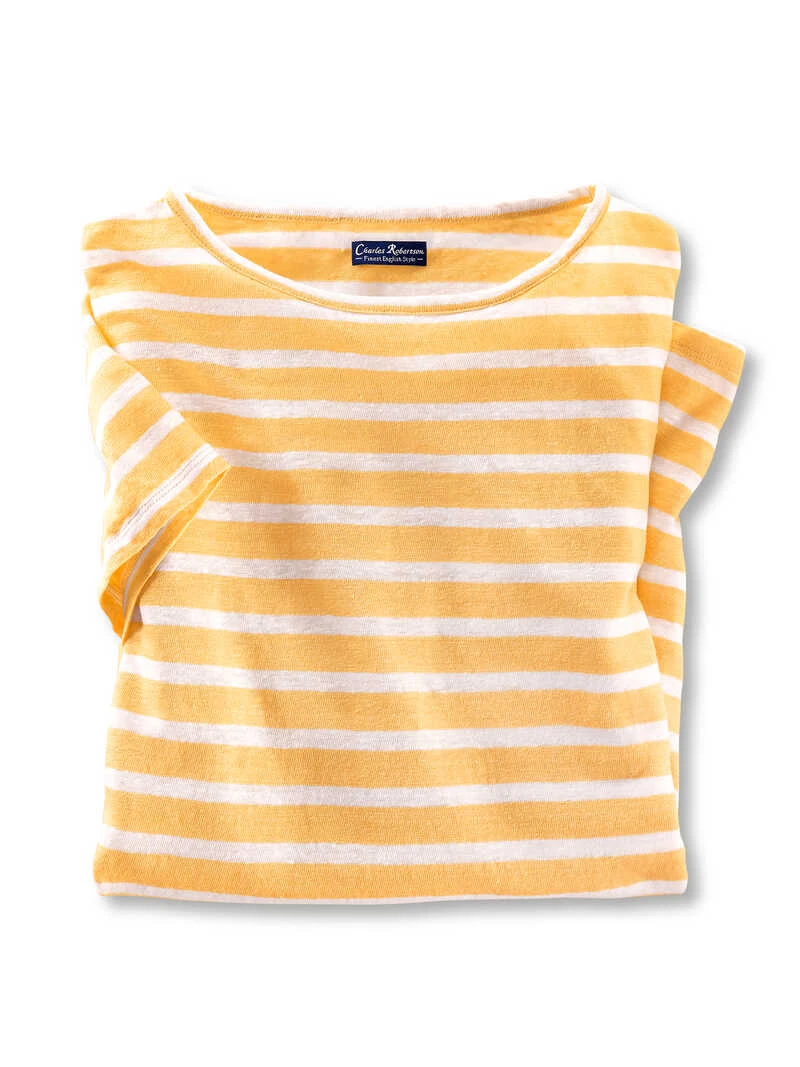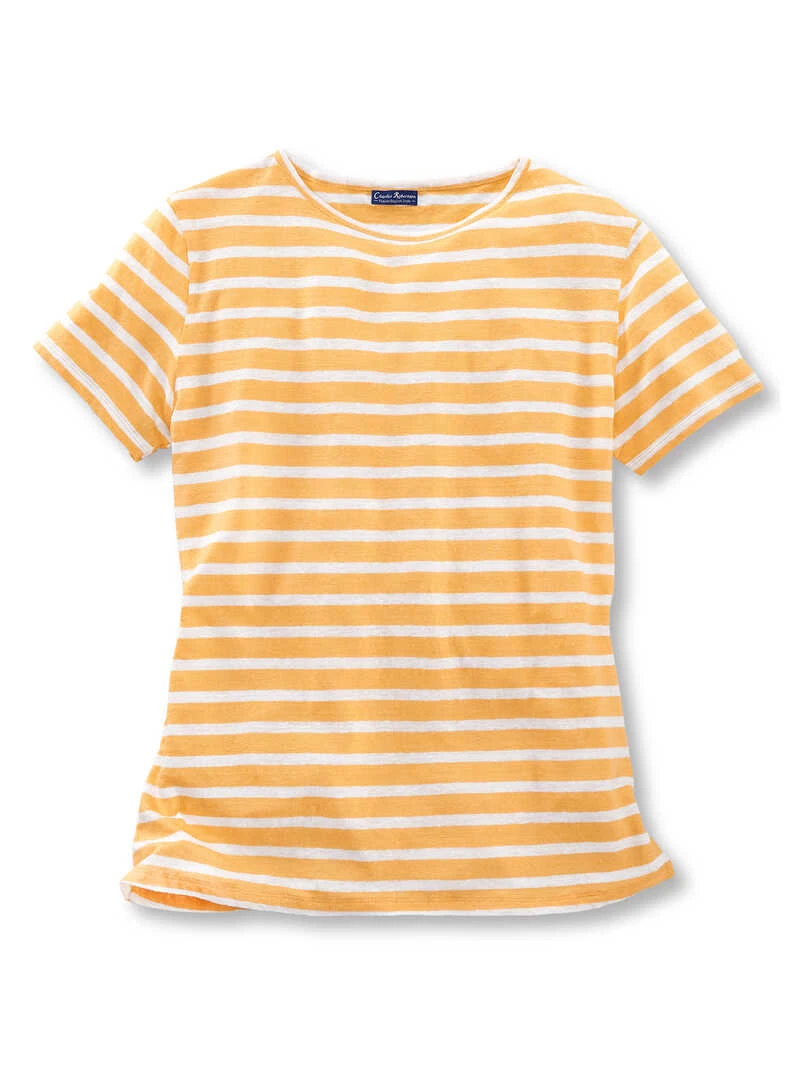 Einen Schuss Ferienlaune verspricht dieses Ringelshirt von Charles Robertson. Den beliebten Klassiker gibt es jetzt in der genialen Sommerfaser Leinen. Sie ist unglaublich luftig und kühlt angenehm, sobald es heiß wird. Leichte Edelknitter schaffen eine lebendige Optik und sind ein untrügliches Zeichen der hochwertigen Naturfaser. Auf diesem weichen Gewebe kommen die typischen Streifen in Gelb und Weiß besonders lässig zur Geltung. Mit Halbarm und Rundhalsausschnitt in lockerer Passform. Regular Fit. Länge ca. 64 cm. Farbe: Butterblume-Weiß. Original Charles Robertson.