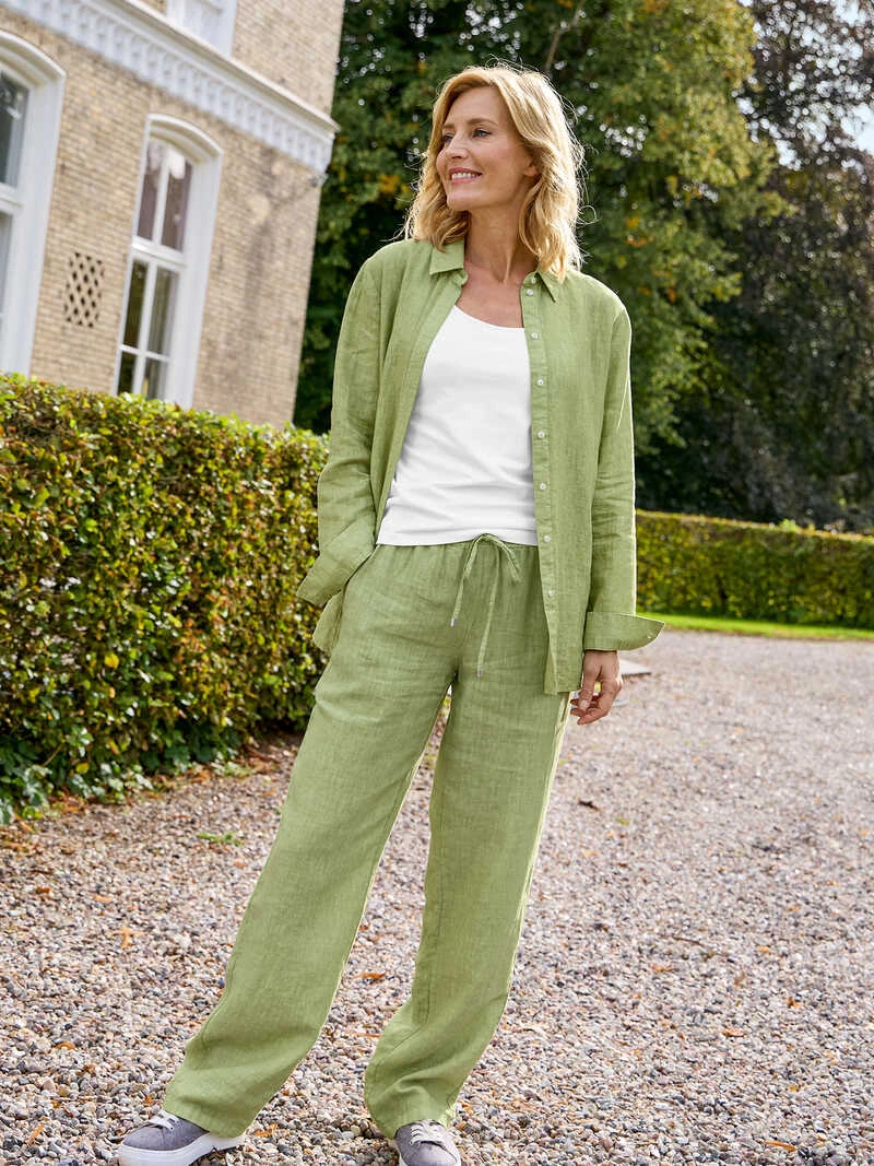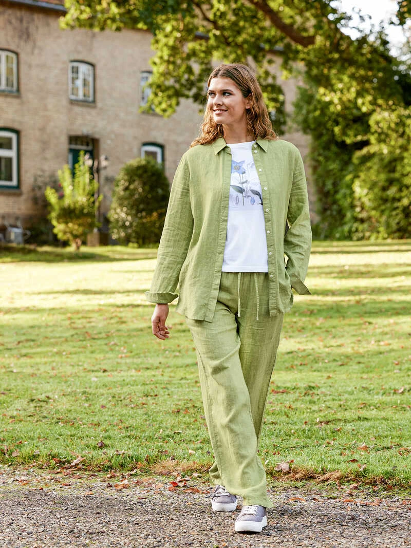 Mit dieser locker geschnittenen, lässigen Hemdbluse liegen Sie im Trend! Und dabei spielt es keine Rolle, ob Sie die Bluse geschlossen oder offen über einem Shirt tragen. Ihr großzügiger Schnitt gleicht einer Hemdjacke und eröffnet viele Tragevarianten. Ganz neu: Die farblich passende Leinenhose gibts auch, so können Sie beides sogar als angesagten Zweiteiler tragen – ein sehr cooler Look! Beide Stücke sind aus irischem Leinen der Traditionsweberei »Baird McNutt« hergestellt. Das Leinen kühlt an heißen Tagen fantastisch, ist strapazierfähig und besitzt seine schönen, typischen Edelknitter. Eine besonders lässige Optik entsteht durch »Garment Dyed«, der Färbung des bereits fertig genähten Kleidungsstücks. Bluse mit Hemdkragen und Manschetten. Lockere Passform (Modern Fit). Länge ca. 70 cm. Ob einzeln oder zusammengetragen – dieses Leinenset mit dem Overshirt und der weiten Hose ist eine echte Bereicherung für Ihre Outfits! Farbe: Irish Green. Gewebe von Baird McNutt. Made by Charles Robertson.