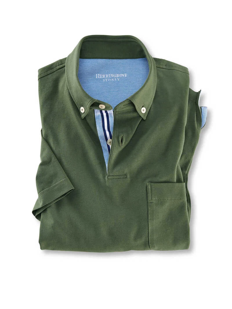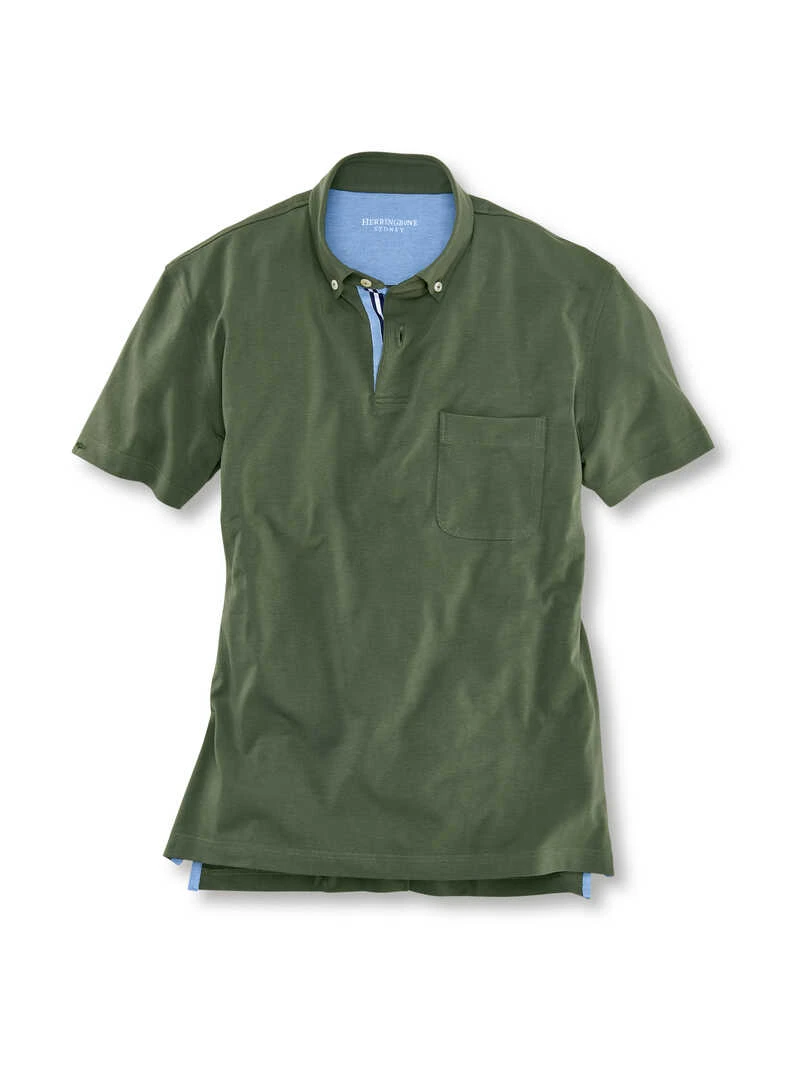 Entspannter als ein Hemd, seriöser als ein T-Shirt! Der besondere Blickfang dieses Polos sind die kleinen Country-Details: Besätze aus hellblau melierter Piqué-Struktur sowie kontrastierendes Ripsband an der Knopfleiste. Der mittelschwere Baumwoll-Jersey bester Qualität verhilft dem Shirt zu dem charismatisch glatten Griff und garantiert besten Tragekomfort. Normale Passform (Regular Fit) mit ‚Button Down‘-Kragen, Knöpfen in Perlmutt-Optik, aufgesetzter Brusttasche, kleinen Seitenschlitzen (mit Gewebeeinsatz) und geradem Saumabschluss. Länge ca. 75 cm. Farbe: olivgrün. Original Herringbone.
