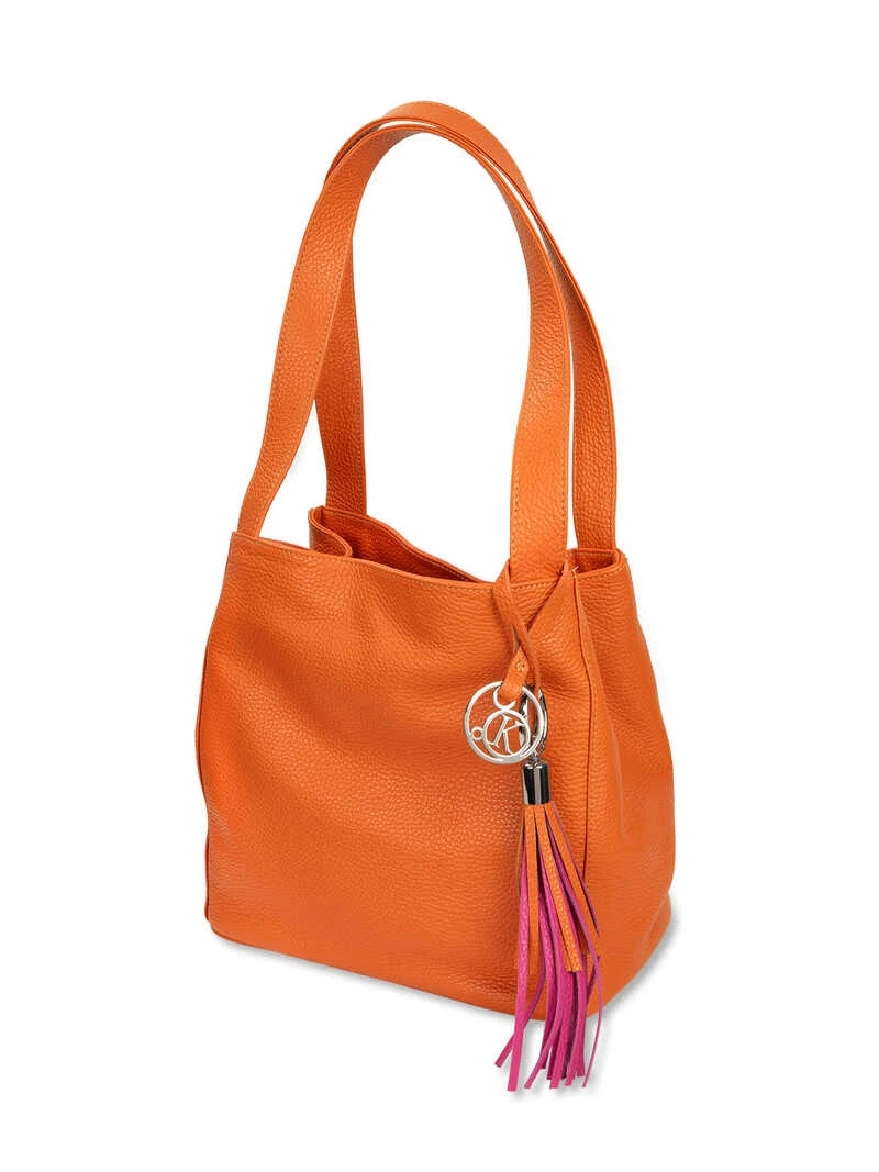 Alle lieben unseren klassischen Lederbeutel von Kensington. Hier zeigt er sich in modernem Orange und schmückt sich zusätzlich mit einer hübschen, abnehmbaren Tassel. Das genarbte Leder fühlt sich wunderbar weich an und die Verarbeitung ist wie immer exquisit. Das geräumige Hauptfach lässt sich mit Magnetdruckknopf schließen. Für Ordnung sorgen zwei große Reißverschlusstaschen und ein Handyfach. Besonders komfortabel ist unser Klassiker durch zwei stabile Trageriemen (ca. 58 cm). Größe 26 x 25 x 16 cm. Farbe: Orange. Original Kensington.