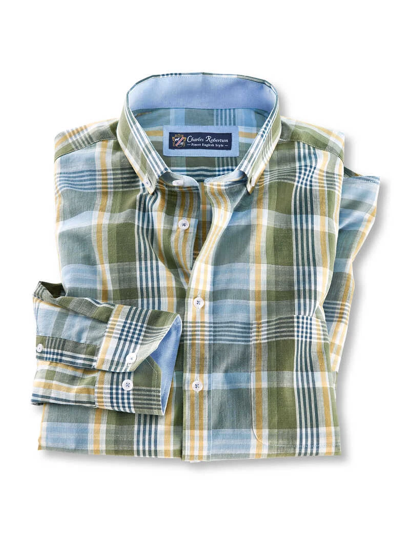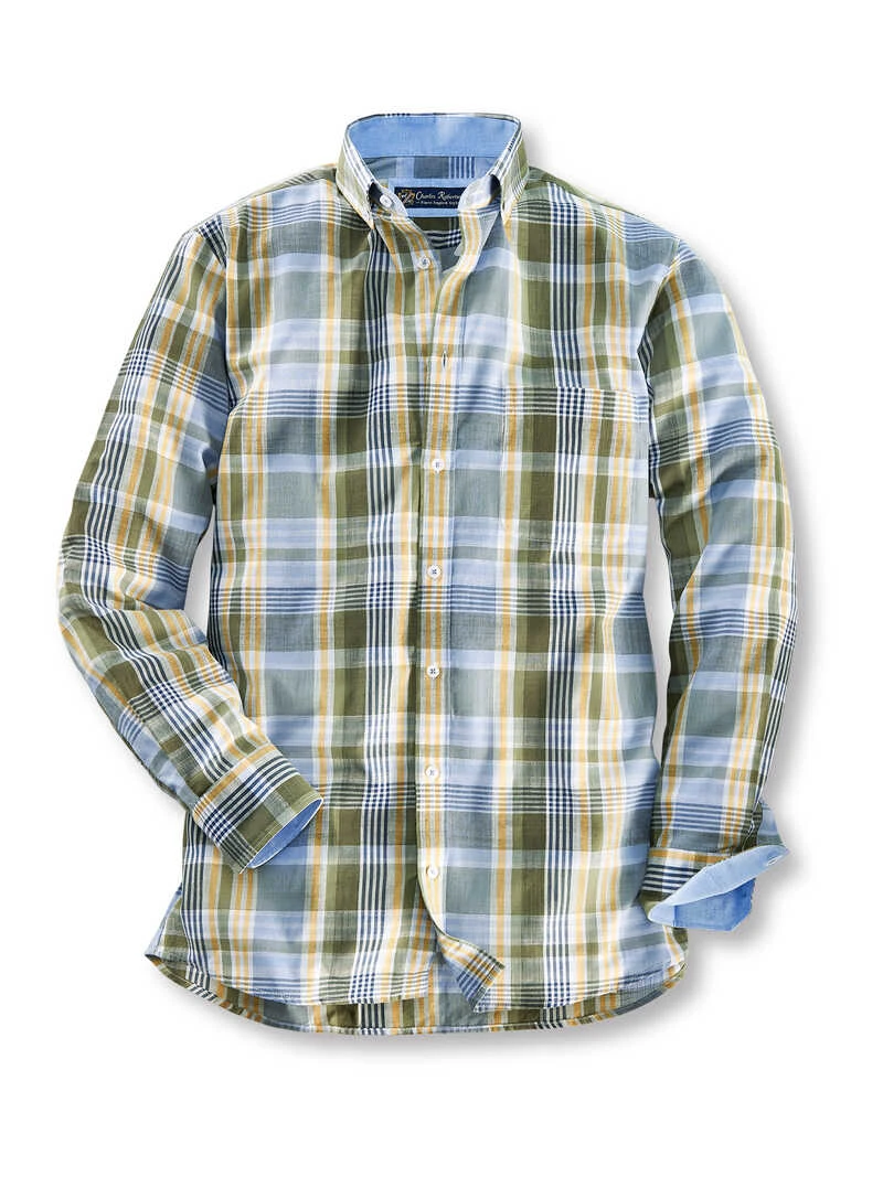 Dieses Karohemd ist durch seine frische Farbgestaltung in Blau, Oliv, Gelb und Ecru ein sommerlicher Blickfang zu vielen Anlässen! Doch richtig spannend ist sein innovativer Stoff: Das luftdurchlässige Gewebe sorgt durch seine unterschiedlich dicken Fäden für eine markante Leinenoptik. Der große Vorteil zu echtem Leinen: Dieses Hemd knittert nicht und muss deshalb auch kaum gebügelt werden. Dabei ist es herrlich weich, leicht und angenehm zu tragen, ein echter Gewinn an warmen Tagen! Mit »Button-Down«-Kragen, aufgesetzter Knopfleiste, einer Brusttasche, gerundetem Saum und Zwei-Knopf-Manschetten. Bequeme Passform (Comfort Fit). Farbe: Blau-Oliv-Gelb. Original Charles Robertson.