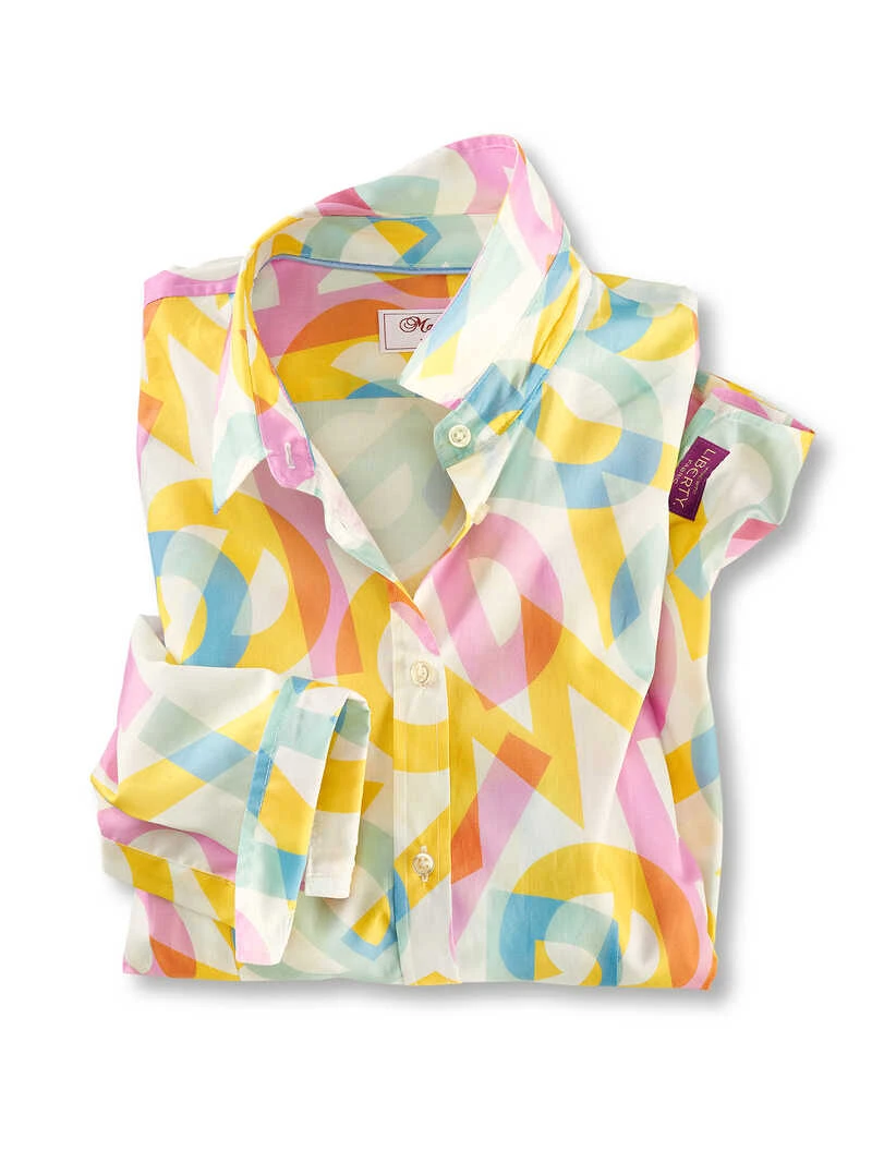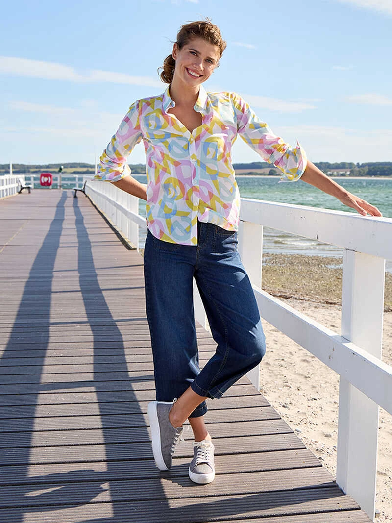Diese Bluse macht das Outfit! Ihr moderner, junger Look mit dem pastelligem Allover-Druck macht sie zum Eyecatcher. Der sensationelle Print mit seinen bunten Pastellfarben nennt sich »Letter« und kommt vom Stoff-Spezialisten schlechthin: »Liberty of London«. Bekannt für seine außergewöhnlichen Muster, meist jedoch Blütenkreationen. Genial ist auch das Material, eine luftig-leichte, superfeine Baumwollqualität mit dem Namen »Tana Lawn«. Mit aufgesetzter Knopfleiste, Manschetten, gerundetem Saum und Knöpfen in Perlmuttoptik. Beim Tragen fühlt sich diese Bluse wie ein luftiger Hauch an – einfach phänomenal! Leicht taillierte Passform (Regular Fit). Länge ca. 67 cm. Farbe: Offwhite. Original Mayfair.