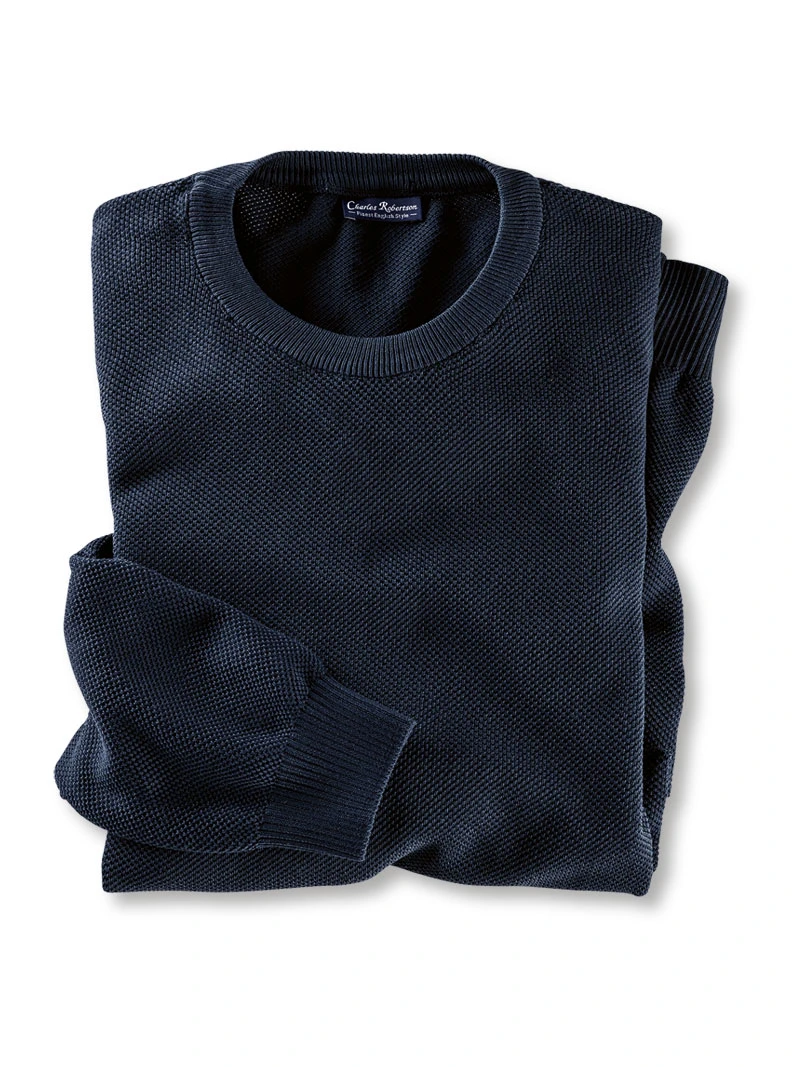 Anziehen, wohlfühlen, glücklich sein – so lautet das einfache Rezept dieses wunderbar leichten Sommerpullis! Sein feiner Strukturstrick ist ein dezenter Blickfang und sorgt dafür, dass sich der Pullover schön kühl anfühlt und toll zu tragen ist. Super in Form bleibt er durch die spezielle Ausrüstung der Baumwollgarne. Ganz gleich ob über dem Hemd getragen oder als Solist, dieser Lightweight-Pullover ist ein wunderbares Basic für zahlreiche Gelegenheiten zu einem sehr attraktiven Preis! Normale Passform (Regular Fit). Farbe: Navy. Original Charles Robertson.