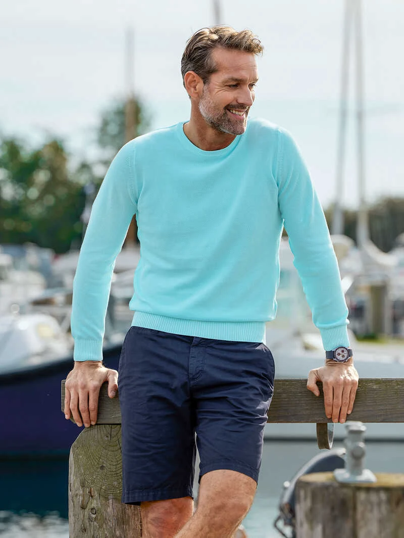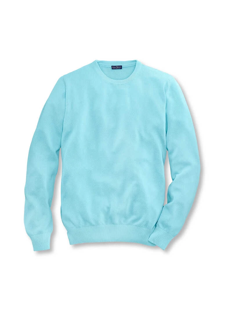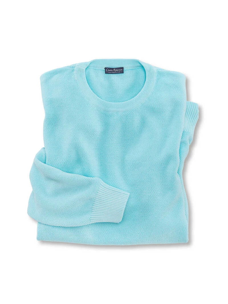 Anziehen, wohlfühlen, glücklich sein – so lautet das einfache Rezept dieses leichten Sommerpullis. Sein feiner Strukturstrick ist ein dezenter Blickfang und sorgt dafür, dass sich der Pullover schön kühl anfühlt und toll zu tragen ist. Super in Form bleibt er durch die spezielle Ausrüstung der Baumwollgarne. Ganz gleich ob über dem Hemd getragen oder als Solist, dieser Lightweight-Pullover ist ein wunderbares Basic für zahlreiche Gelegenheiten zu einem sehr attraktiven Preis! Normale Passform (Regular Fit). Farbe: Sky. Original Charles Robertson.