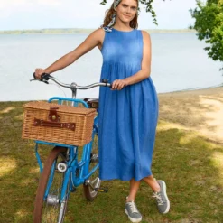 Genauso fühlt sich der Sommer an! Dieses luftige Kleid ist aus reinem Leinen, herrlich kühlend und daher an heißen Tagen durch nichts zu toppen. Die typischen Knitter und die edle Struktur des natürlichen Leinens kommen auf dem sommerlichen Kornblumenblau fantastisch zur Geltung. O’Neil of Dublin, eine irische Manufaktur, hat das luftig-leichte Leinenkleid stimmig umgesetzt. Die angesagte, individuelle Hängerform des Kleides lässt durch das weite, angekrauste Rockteil wunderbar die Luft zirkulieren. Mit einem Cardigan drüber ist dieses ärmellose Kleid ein besonderer und außergewöhnlicher Sommerlook! Mit Zipper im Rückteil; ausgestellte Passform (Regular Fit). Länge ca. 115 cm. Farbe: Kornblumenblau. Original O’Neil of Dublin.