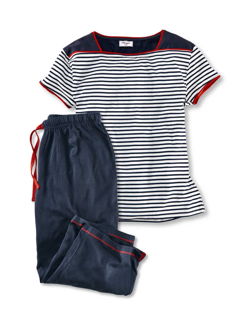 Gekämmte, reine Baumwolle macht den Single-Jersey dieses Shorty-Pyjamas ungeahnt weich und fein! Sein maritimer Look in Navy-Weiß und als smartes Highlight die Kontrastfarbe Rot locken den Sommer und die Sonne. Besonders lässig wirkt das Shirt mit seinen Ringeln und den kurzen Ärmeln; die 3/4-lange Hose ist ideal in heißen Nächten und dank elastischem Bund und Bindeband angenehm zu tragen. In bequemer Weite (Comfort Fit). Farbe: Navy-Weiß. Original Mayfair.