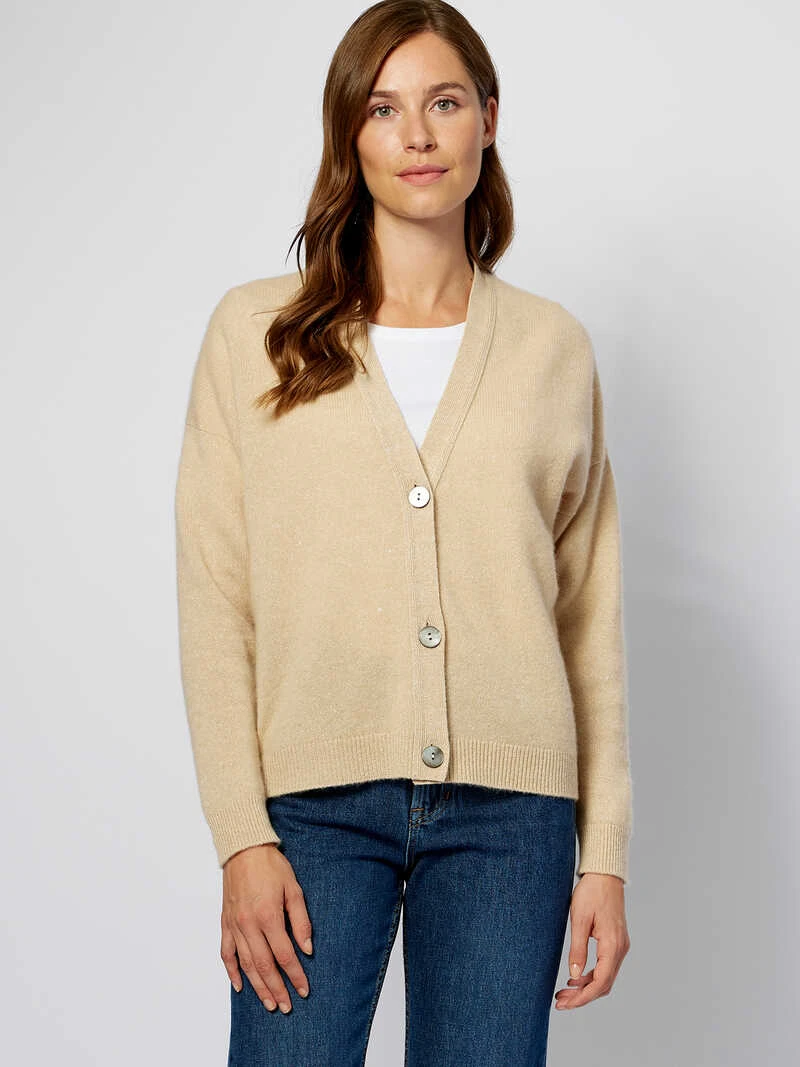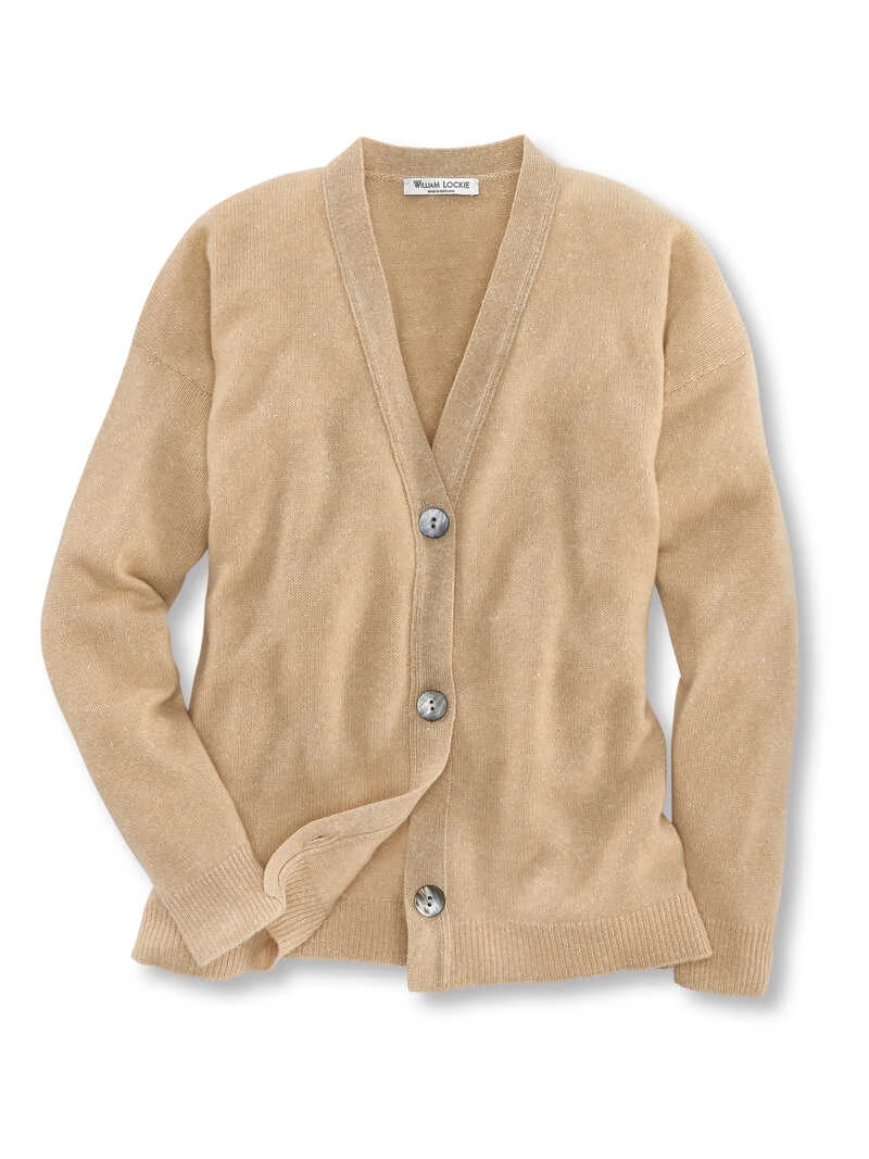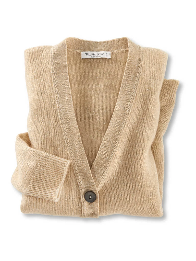 Bei der Qualität von Kaschmir gibt es große Unterschiede! Und wenn sich einer mit der allerbesten Kaschmirqualität vortrefflich auskennt, so ist es das schottische Traditionsunternehmen Todd & Duncan. Mit luftig-kühlem Leinen wird es eine richtig luxuriöse, herrlich softe und leichte Sommermischung – was diesen Cardigan zum absoluten Lieblingsstück macht. Fürs Design und Verarbeitung hat dann die Strickmanufaktur William Lockie aus Schottland gesorgt: großzügig geschnitten, genauso wie man es jetzt trägt, mit einer schön aufgesetzten Knopfleiste, die einen schmeichelnden V-Ausschnitt formt, und großen Perlmuttknöpfen. Ein Cardigan in einer seltenen Luxusmischung, wie er weicher und angenehmer kaum sein kann! Mit Rippbündchen an Ärmeln und Saum. Weite Passform (Modern Fit). Länge ca. 63 cm. Farbe: Sand-Melange. Garn von Todd & Duncan, Scotland. Made by William Lockie.