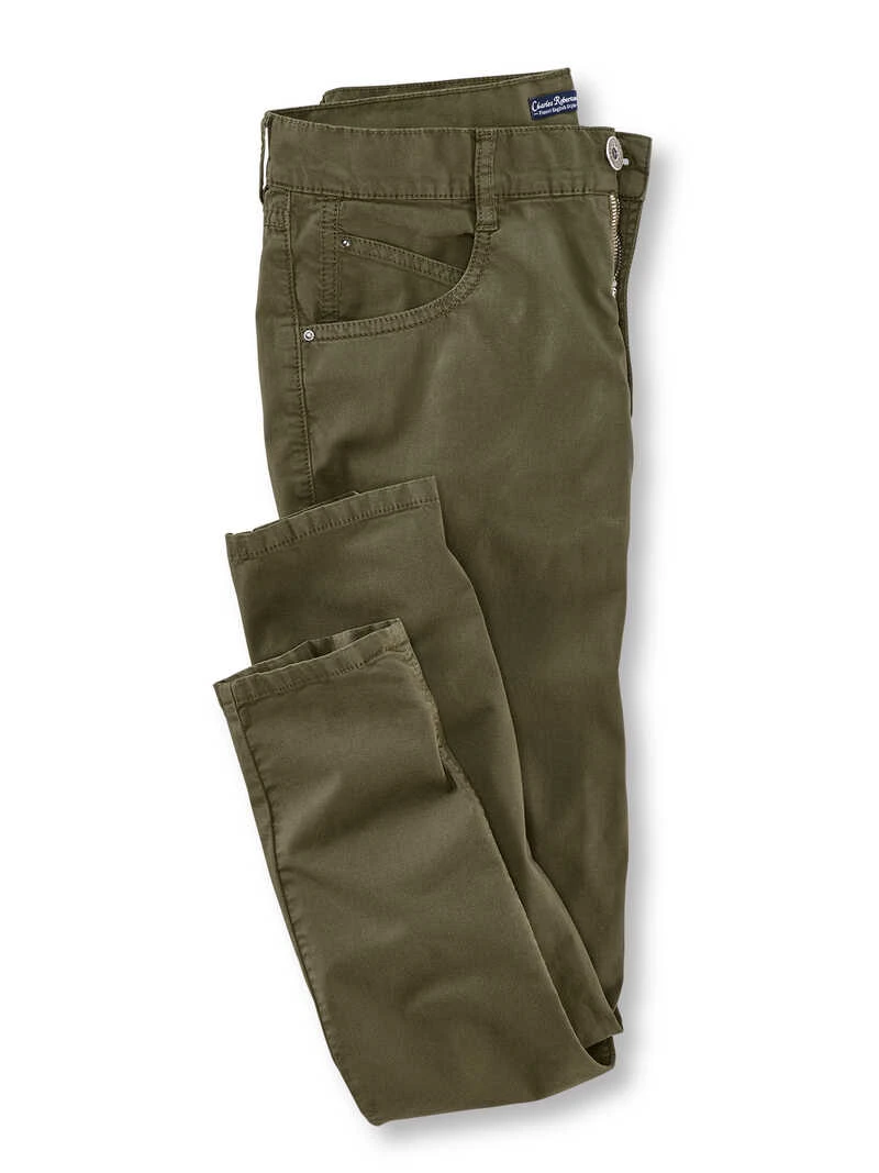 Diese leichte Baumwollhose im sportiven Five-Pocket-Schnitt lässt sich wunderbar variabel stylen: mal gekrempelt, mal lang, casual mit Sneakers, chic mit Loafern oder lässig mit Sandalen! Das moderne Khaki passt richtig gut zu vielen Farben. Dank schlanker Schnittform macht diese Hose eine tolle Silhouette und der Stretchanteil sorgt für erstklassige Bewegungsfreiheit. Eine softe Hose, nicht so schwer wie eine Jeans, macht aber genauso gut alles mit – ideal für den Übergang! Mit zwei Eingrifftaschen und zwei Gesäßtaschen. Schmale Passform (Regular Fit). Fußweite ca. 33 cm; Beininnenlänge ca. 68 cm. Farbe: Khaki. Original Charles Robertson.