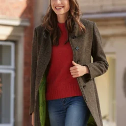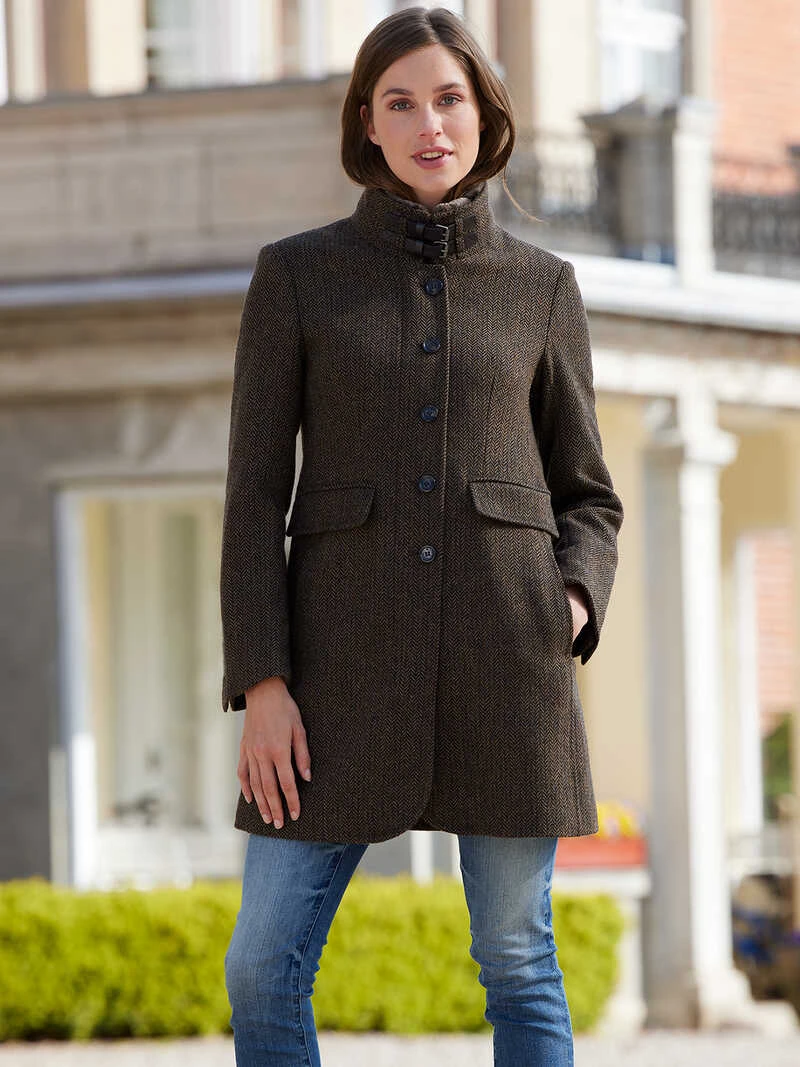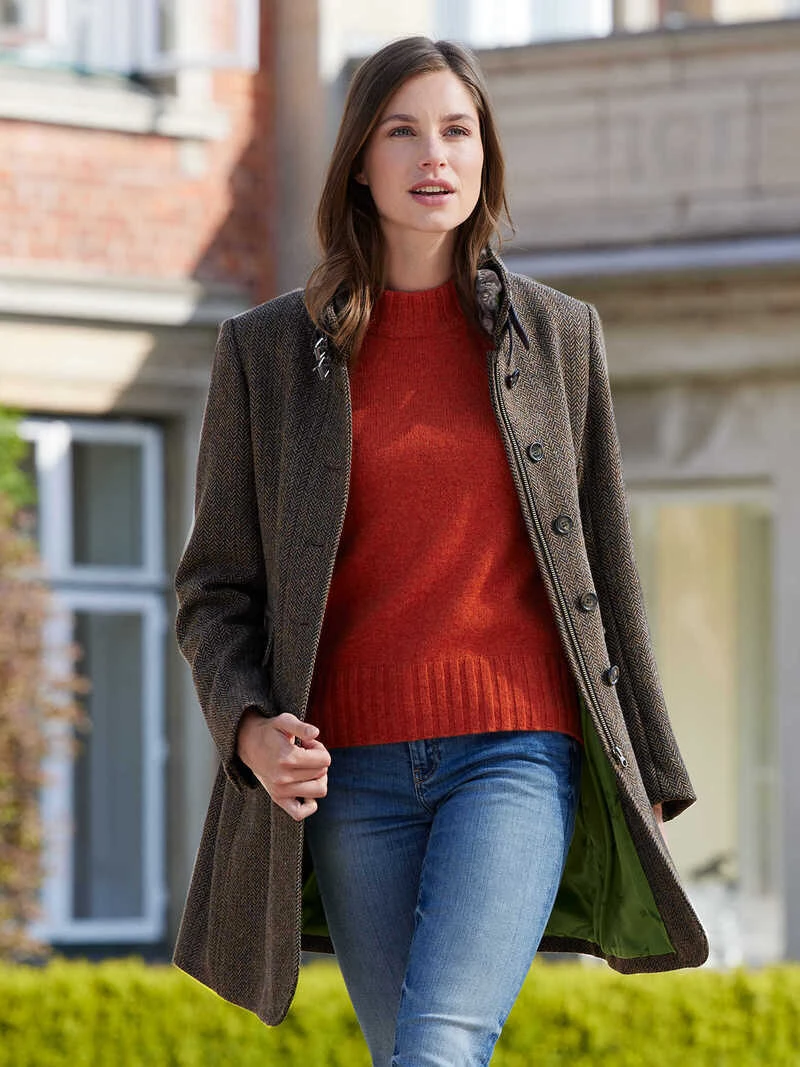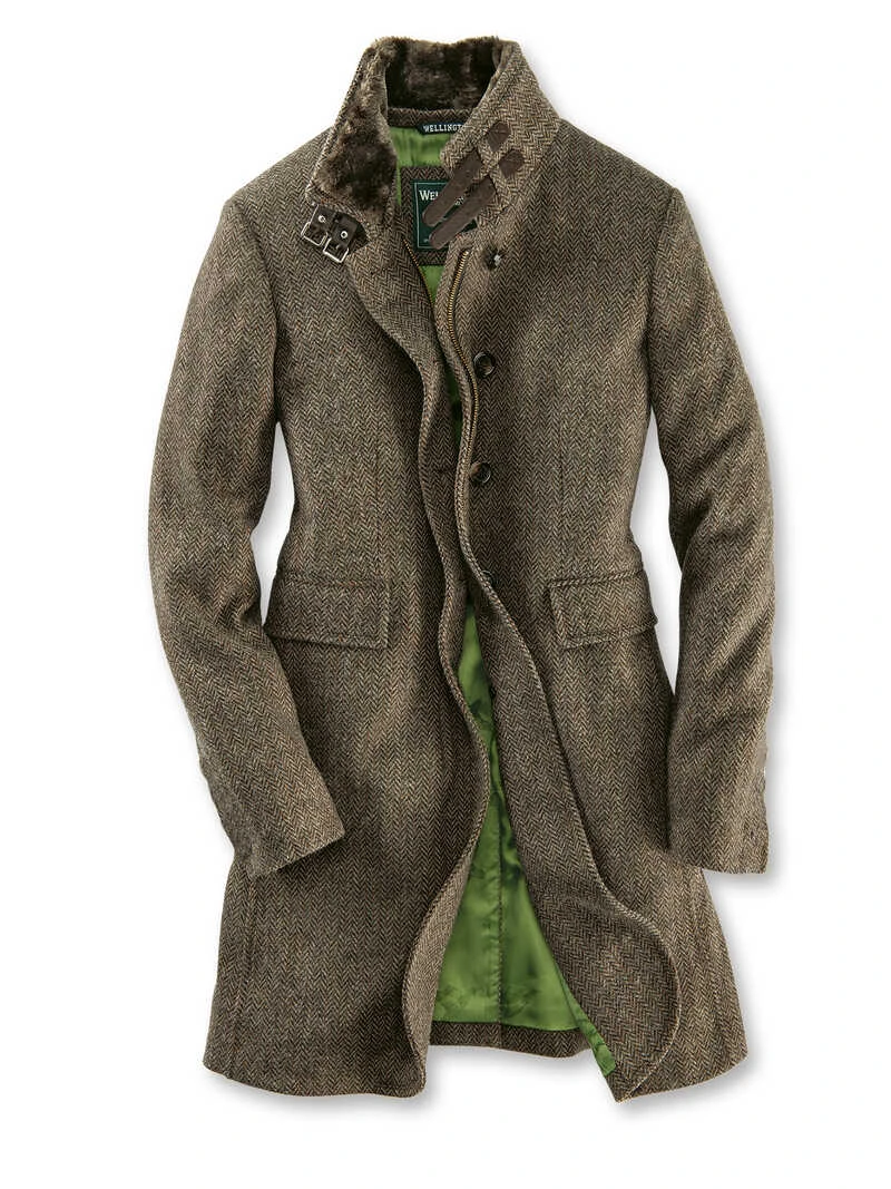 Sportiver ‚Everyday‘-Mantel aus kuschelweichem, warmem Fischgrat-Wollgewebe von Wellington of Bilmore. Besonders schön: der leicht taillierte Schnitt (Regular Fit) mit Stehkragen, der innen mit einem stilvollen, abnehmbaren Webpelz unterlegt ist und mit zwei Schnallen in Lederoptik geschlossen werden kann. Aufwendig und durchdacht gearbeitet mit zwei Schubtaschen, Reißverschluss mit darüber liegender Knopfleiste, rückseitigem Gehschlitz und einer verschießbaren Innentasche. Länge ca. 87 cm. Farbe: Fischgrat Braun. Futter Apfelgrün. Original Wellington of Bilmore.