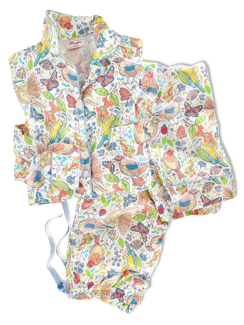 In diesen außergewöhnlichen Sommer-Pyjama kann man sich nur verlieben! Mit seinem Feuerwerk aus pastelligen Farben und dem fantasievollen Allover-Print ist er kaum zu übertreffen. Dieses großartige Muster »Birds & Butterflies« hat Ellie Fisher entworfen, die an der »Arts University of Leeds« studiert hat. Ihre ungewöhnlichen Designs erreichen große internationale Aufmerksamkeit. Der zarte Baumwoll-Batist ist schön luftig und fühlt sich wunderbar auf der Haut an. Feine Kontrastpaspeln runden den Stil perfekt ab. Das Oberteil ist mit abgerundetem Kragen und aufgesetzter Brusttasche ausgestattet, die Hose mit elastischem Bund und Bindeband. Großzügige Passform (Comfort Fit). Farbe: Ecru. Original Mayfair.