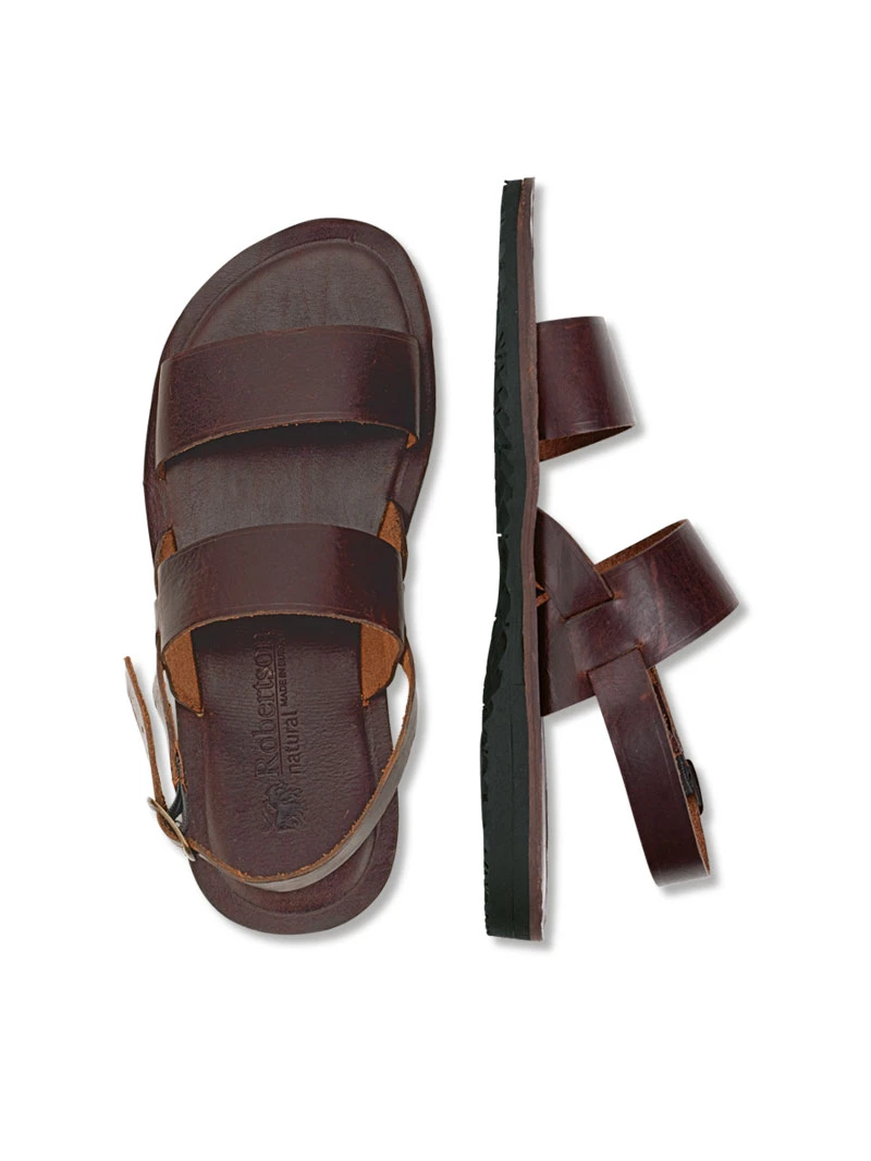 Das hochwertige Vollrindsleder dieser Sandale ist gut 2 mm dick und zeugt von einer fantastischen Qualität. Es ist rein pflanzlich gegerbt, weich und gleichzeitig äußerst stabil. Offene Lederkanten unterstreichen die moderne, schlichte Form. Robertson Natural steht für eine ökologische Schuhherstellung auf höchstem Niveau und produziert ausschließlich in Europa. Eine verstellbare Schließe und die Verarbeitung mit einem Elastikband sorgen für perfekten Tragekomfort. Dank der leicht gepolsterten Decksohle und der profilierten Gummiaußensohle ist diese Sandale an heißen Tagen wunderbar zu tragen! Farbe: Dunkelbraun. Original Robertson Natural.