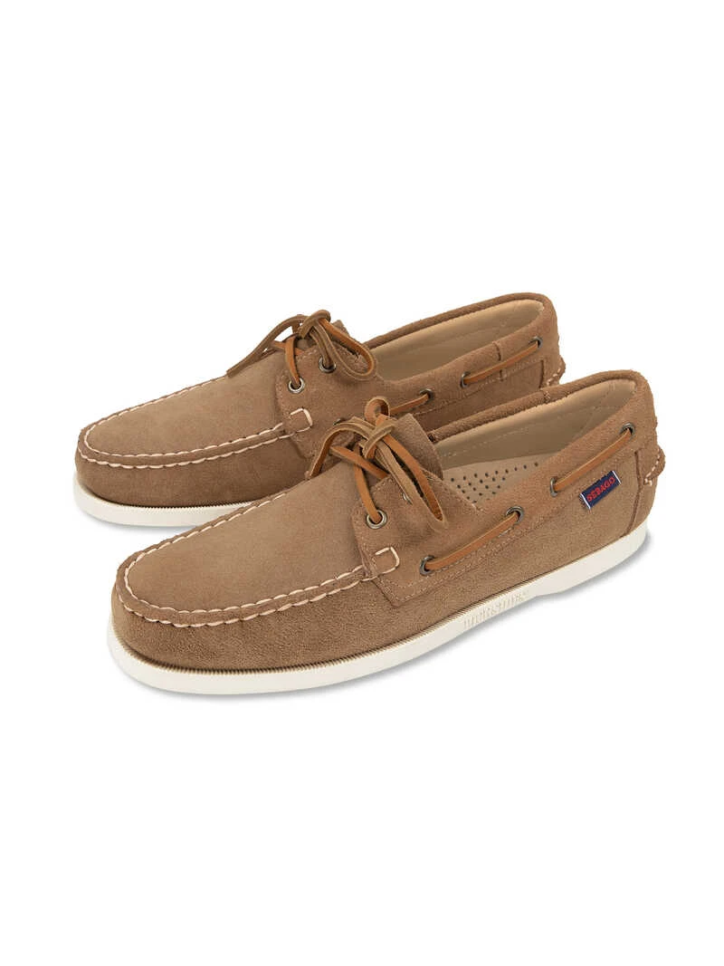 Der »Boat Shoe« von Sebago gilt als der weltweit beste und bequemste seiner Art. Der Schuhhersteller ist über die Grenzen hinaus für seine handgenähten Bootsschuhe bekannt. Diese hier sind aus weichem Nubukleder in typischer Mokassin-Form mit Lederschnürung gearbeitet und angenehm zu tragen. Die flexible, durchgenähte, weiße Gummisohle hat ein leichtes Profil und ist daher rutschfest. Decksohle nicht herausnehmbar. Farbe: Cognac. Original Sebago.