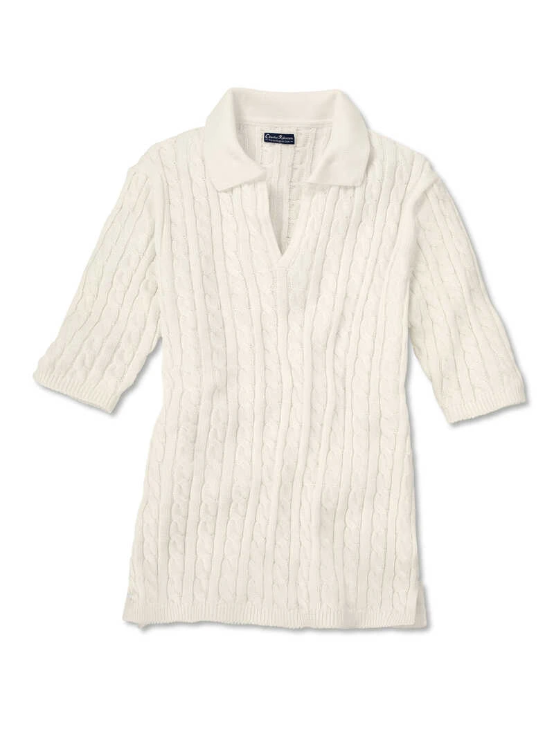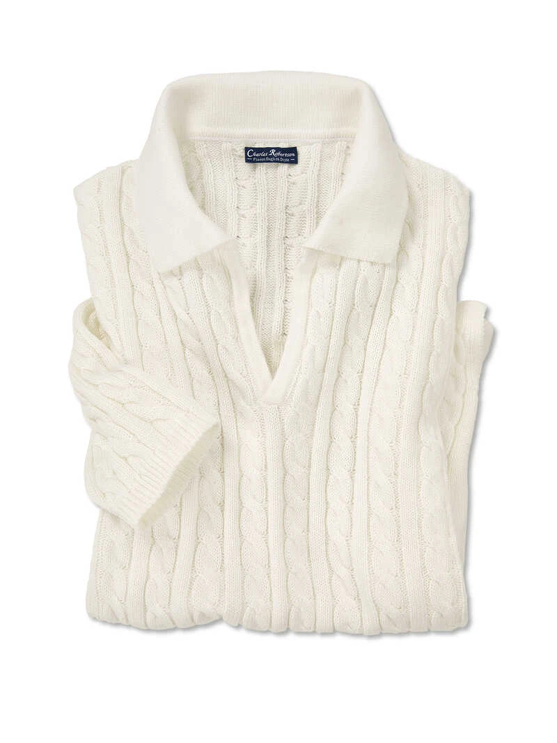Kurzarmpullis sind modisch up to date und dieser trumpft noch als Polovariante mit einem wunderschönen, schmal gestrickten Zopfmuster auf! Die extralangen Kurzärmel reichen bis zu den Ellenbogen, was nicht nur topmodisch ist, sondern auch sehr schmeichelhaft für die Arme. Der kleine Polokragen und die kurze, schmale V-Ausschnittleiste verleihen dem weichen Baumwoll-Strickshirt einen sportiven Touch. Mit schmalen Bündchen an den Ärmeln und Seitenschlitzen am Saum. Gerade Passform (Regular Fit). Länge ca. 61 cm. Farbe: Offwhite. Original Charles Robertson.