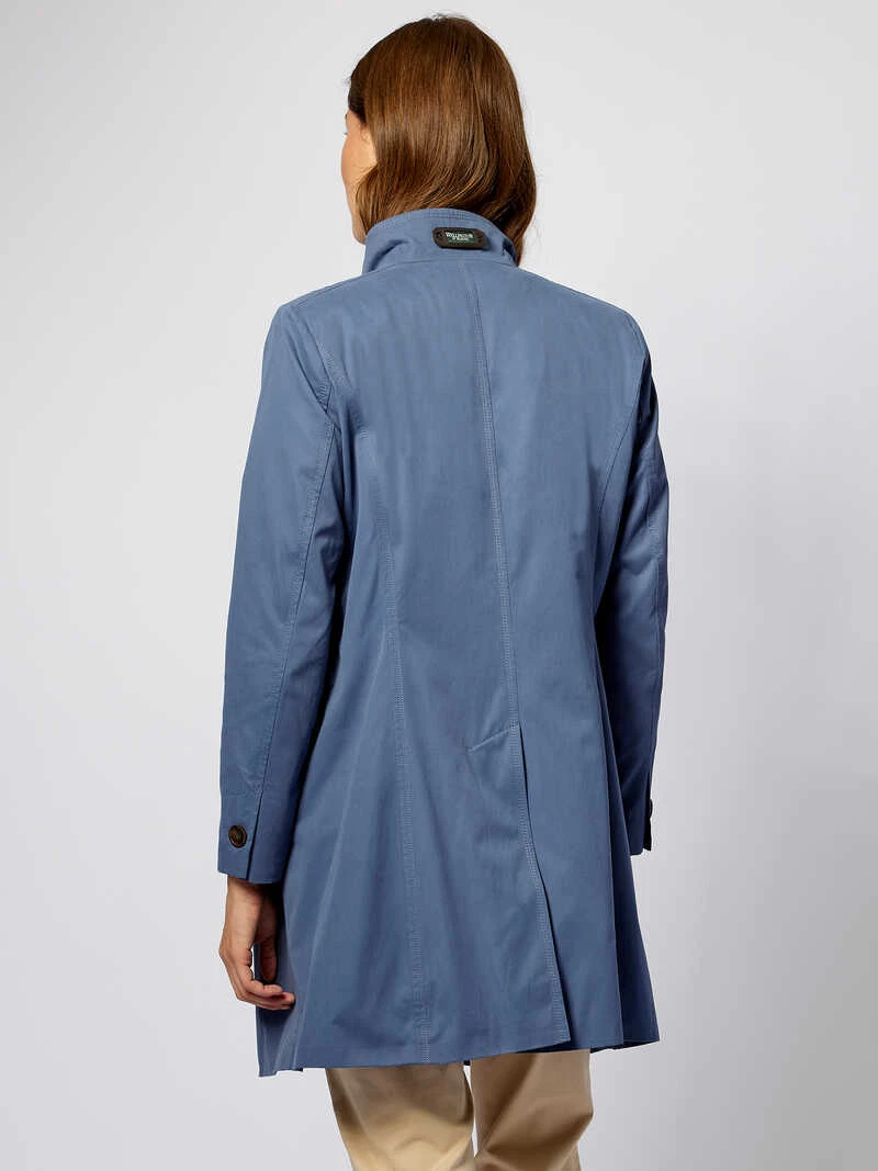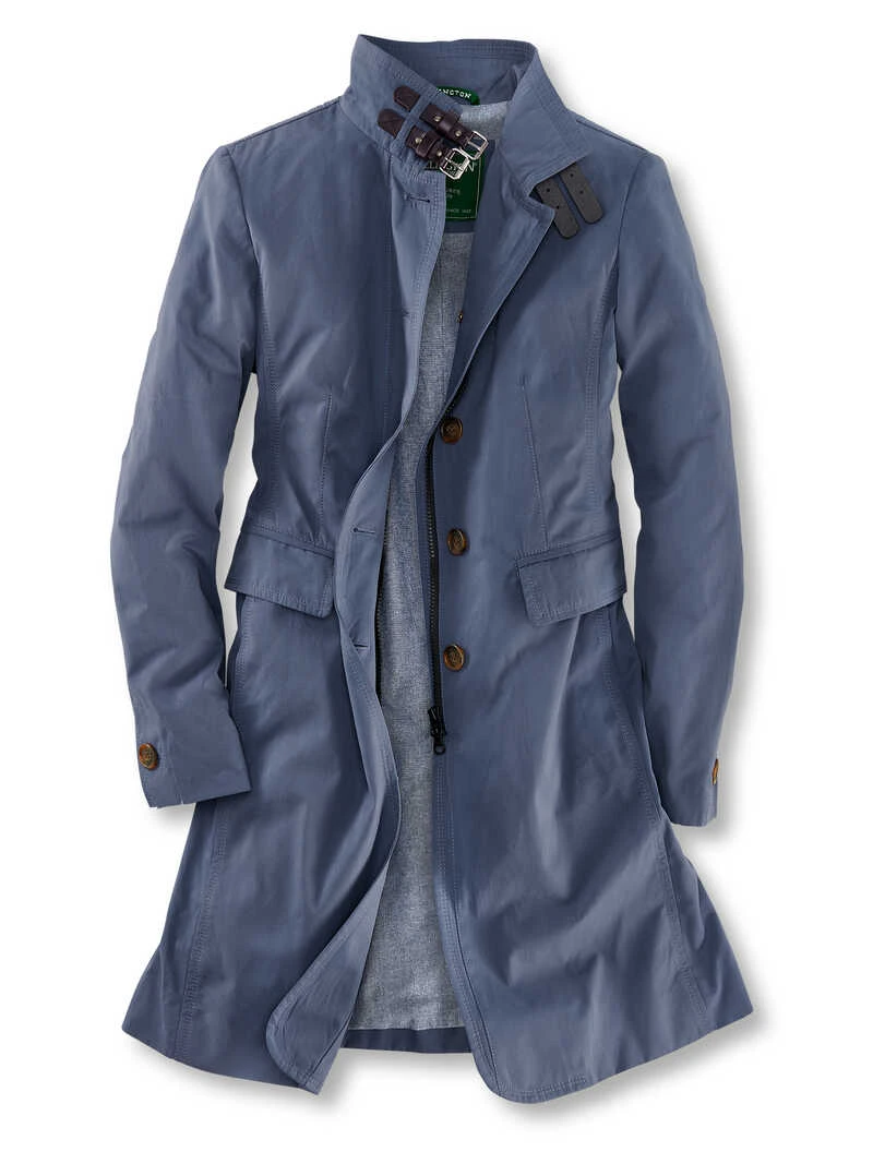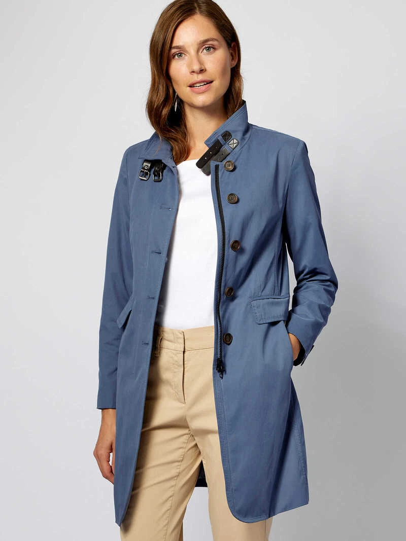Manche Kleidungsstücke wirft man einfach über und sieht fantastisch aus! Genauso eines ist dieser sportive Mantel von Wellington. Er hat die perfekte Länge und zaubert durch seine Wiener Nähte eine taillierte, schmeichelhafte Silhouette. Der schöne Blauton harmoniert wunderbar zu den schwarzen Riegeln in Lederoptik am Stehkragen und den Gravurknöpfen. Das leichte Baumwollgewebe hat eine leicht gewaschene Optik und ist wasserabweisend ausgerüstet. Mit zwei Pattentaschen, einem dunkel abgesetzten Reißverschluss und einer Innentasche. Modern Fit. Länge ca. 88 cm. Farbe: Rauchblau. Original Wellington of Bilmore.