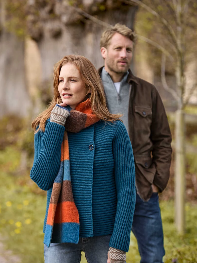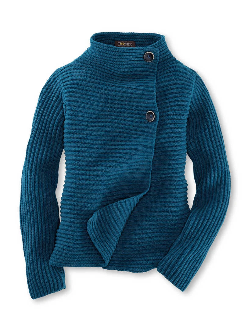 Ein besonders legerer und authentischer Begleiter ist diese Strickjacke in kürzerer Passform. Quergestrickte Optik aus zweifarbigem, kuscheligem Garn mit Knöpfen aus Hornimitat. (Regular Fit) Länge ca. 58 cm. Farbe: Petrol. Original Fisherman out of Ireland.