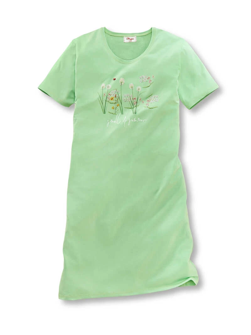 Tiefenentspannte Sommernächte sind mit diesem wunderschönen Nightshirt garantiert! Denn der feine, supersofte Jersey fühlt sich herrlich angenehm an und der relaxte Schnitt umspielt schön den Körper. Auf dem frischen Mint des Kurzarm-Nachthemds kommt der zarte, pastellige Wiesenblumendruck mit dem dezenten Schriftzug »smell of summer« grandios zur Geltung. Gemütlicher kann ein sommerliches Nightshirt wohl kaum sein! Mit Rundhals, kurzen Ärmeln, in gerader Passform (Comfort Fit). Länge ca. 96 cm. Farbe: Mint. Original Mayfair.