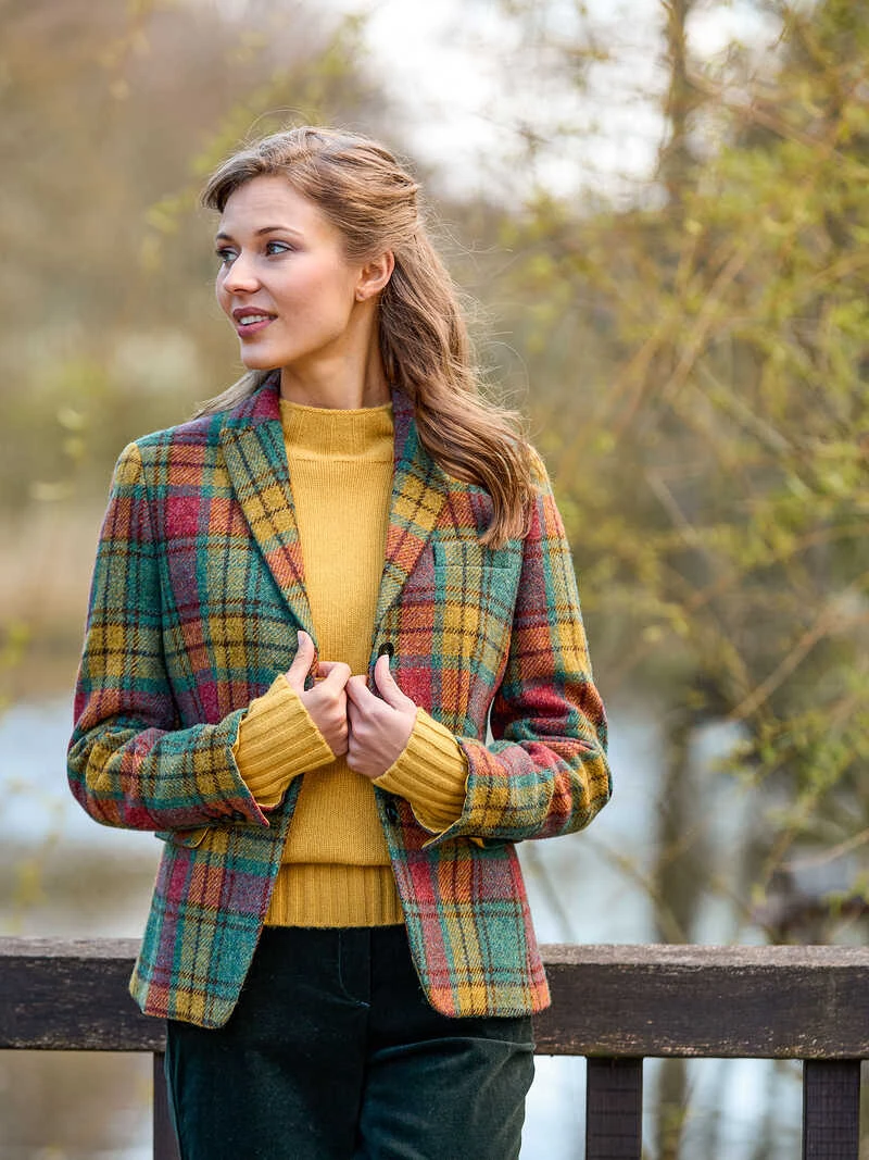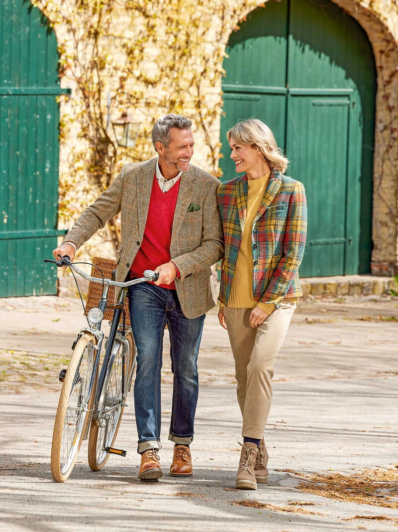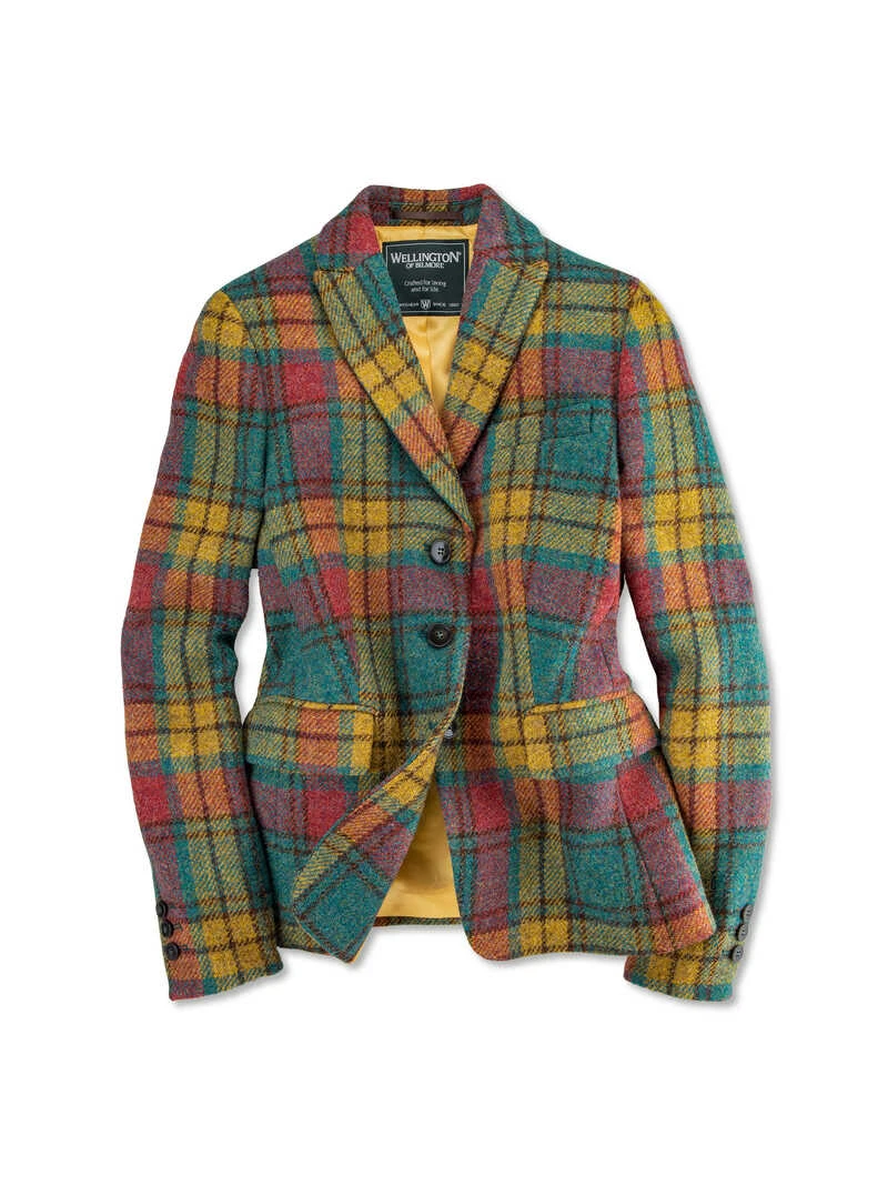 Petrol, Curry und Beere – dieser Tweedblazer bringt mit seinem außergewöhnlichen, schottischen Tartanmuster Farbigkeit in den Herbst! Die außergewöhnliche Farbkombination kommt auf dem exquisiten und nahezu unverwüstlichen Harris Tweed perfekt zur Geltung. Dieser Tweed wird auf der Insel Harris in Schottland von Hand gewebt und ist etwas ganz Besonders. Die Taillierung und die kürzere Schnittform verleihen dem Blazer eine traumhafte Silhouette. Ausgestattet mit Reverskragen, zwei Pattentaschen, Knöpfen in Hornoptik, Rückenschlitz und einer Innentasche. Klassische, kürzere Form (Regular Fit). Komplett gefüttert. Länge ca. 65 cm. Original Wellington of Bilmore.