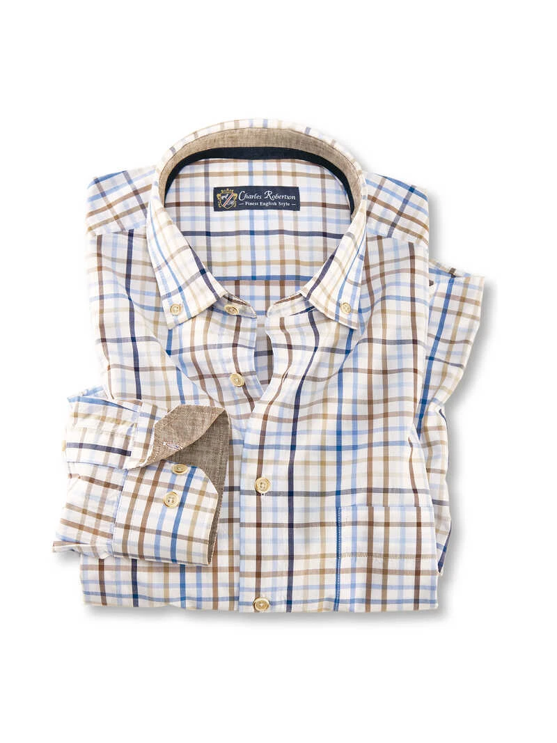Hemden im Tattersall-Check könnten britischer nicht sein! Das stilechte Karomuster ist fester Bestandteil des traditionell englischen Freizeitlooks. So komplettiert es auch jedes Country-Outfit im Handumdrehen. Blickfänge sind die beigefarbenen Besätze in Leinenoptik, die sich im Kragen und bei geöffneten Manschetten finden. Mit ‚Button-Down‘-Kragen, Brusttasche und verstellbaren Manschetten. Ein Hemd, das Sie in der Freizeit als auch im Business treffend gut kleidet! Bequeme Passform (Comfort Fit). Farbe: Beige-Blau. Original Charles Robertson.
