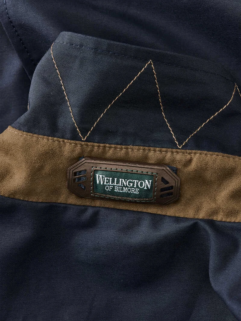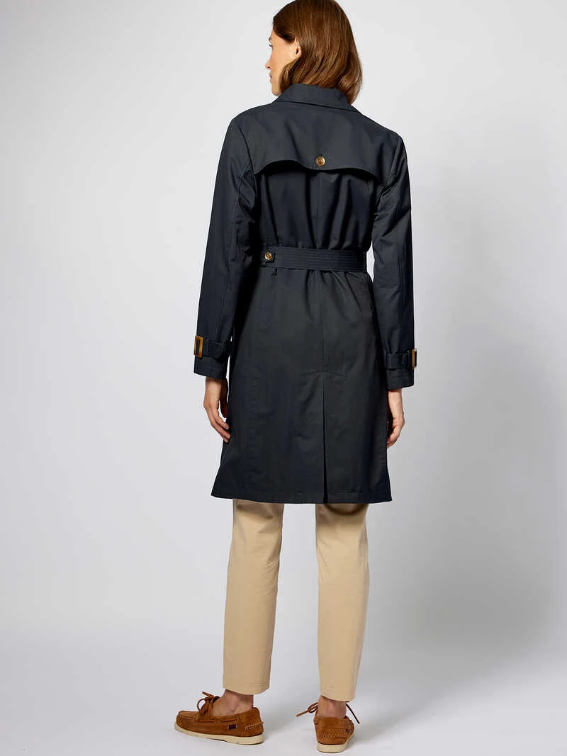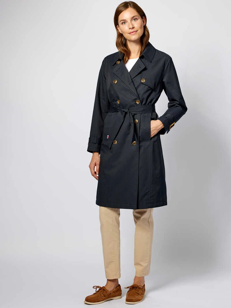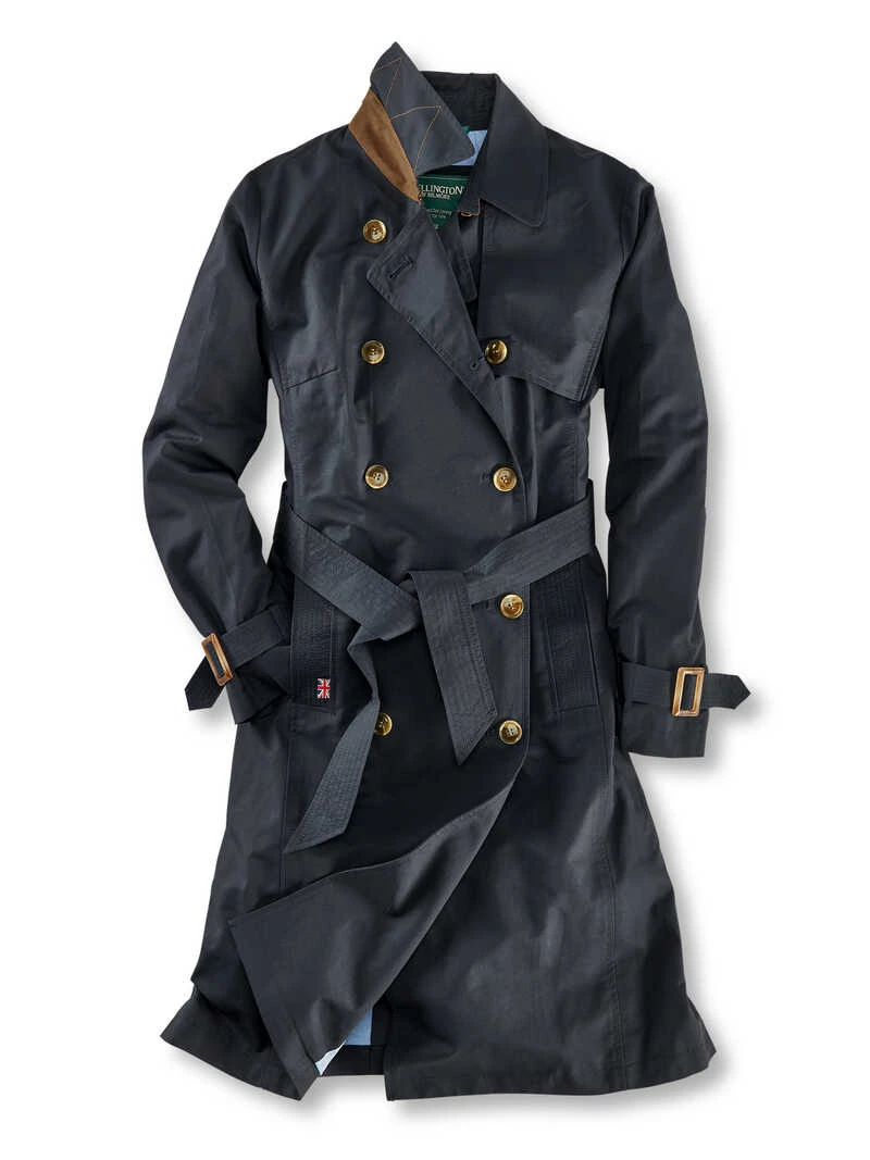 Ein Klassiker in der Frühlingsgarderobe ist der Trenchcoat! Vom Jacken- und Mantelspezialisten Wellington of Bilmore top umgesetzt in sportivem Marineblau. Der Mantel ist sehr aufwendig verarbeitet und bietet alle charakteristischen Zutaten, die ein Trenchcoat braucht: die kontrastfarbigen Ärmelriegel und Knöpfe; einen Kragen, der dank innerem Riegel auch hochgeschlossen getragen werden kann sowie eine Vorder- und Rückenpasse. Sehr smart ist der Bindegürtel, der dank Knopf-Riegeln genau da bleibt, wo er soll – so kann er auch nicht verloren gehen! Schöne Details sind bei hochgestelltem Kragen der camelfarbene Steg (hinten mit Logo) und eine angedeutete Kellerfalte im Rückteil. Das bunte Paisleyfutter sieht bei umgeschlagenen Ärmeln besonders reizvoll aus; ansonsten ist das Futter hellblau. Mit zwei Eingrifftaschen und zwei Innentaschen. Gerade Passform (Regular Fit). Länge ca. 98 cm. Farbe: Navy. Made by Wellington of Bilmore.