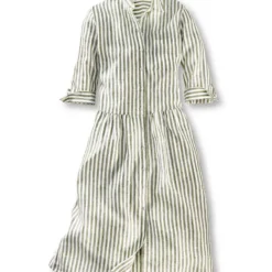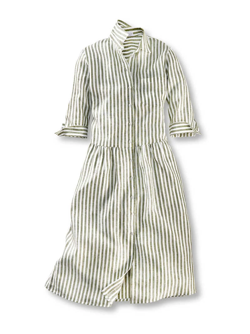 Unser lässiges Sommerkleid mit seiner weit schwingenden Form hat topaktuelle Streifen erhalten! Das moderne Oliv und Offwhite verleihen ihm einen ganz neuen Look im angesagten Nature-Trend. Das Ganze ist aus luftigem Leinen und somit an heißen Tagen kaum zu übertreffen! Zum Kühleffekt paart sich die natürliche Optik: Ein dezenter Glanz und gewollte Edelknitter kommen auf dem Leinen grandios zur Geltung. Das Oberteil ist wie eine Hemdbluse geschnitten, darunter befindet sich das angekräuselte Rockteil. Mit hellen Sneakers oder coolen Boots getragen entsteht mit diesem Leinenkleid im Nu ein Trendlook! Mit Hemdkragen, Brusttasche, 3/4-Arm mit Manschette und Perlmuttimitatknöpfen. Weite Passform (Modern Fit). Länge ca. 118 cm. Farbe: Oliv-Offwhite. Original Charles Robertson.