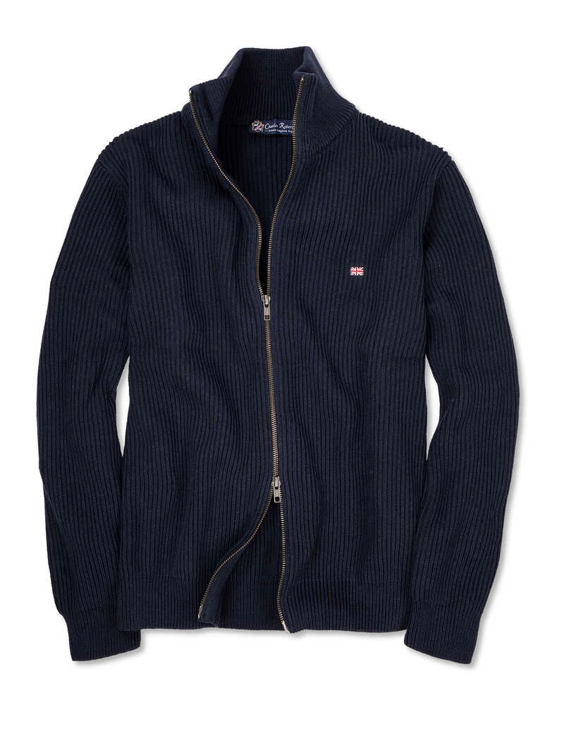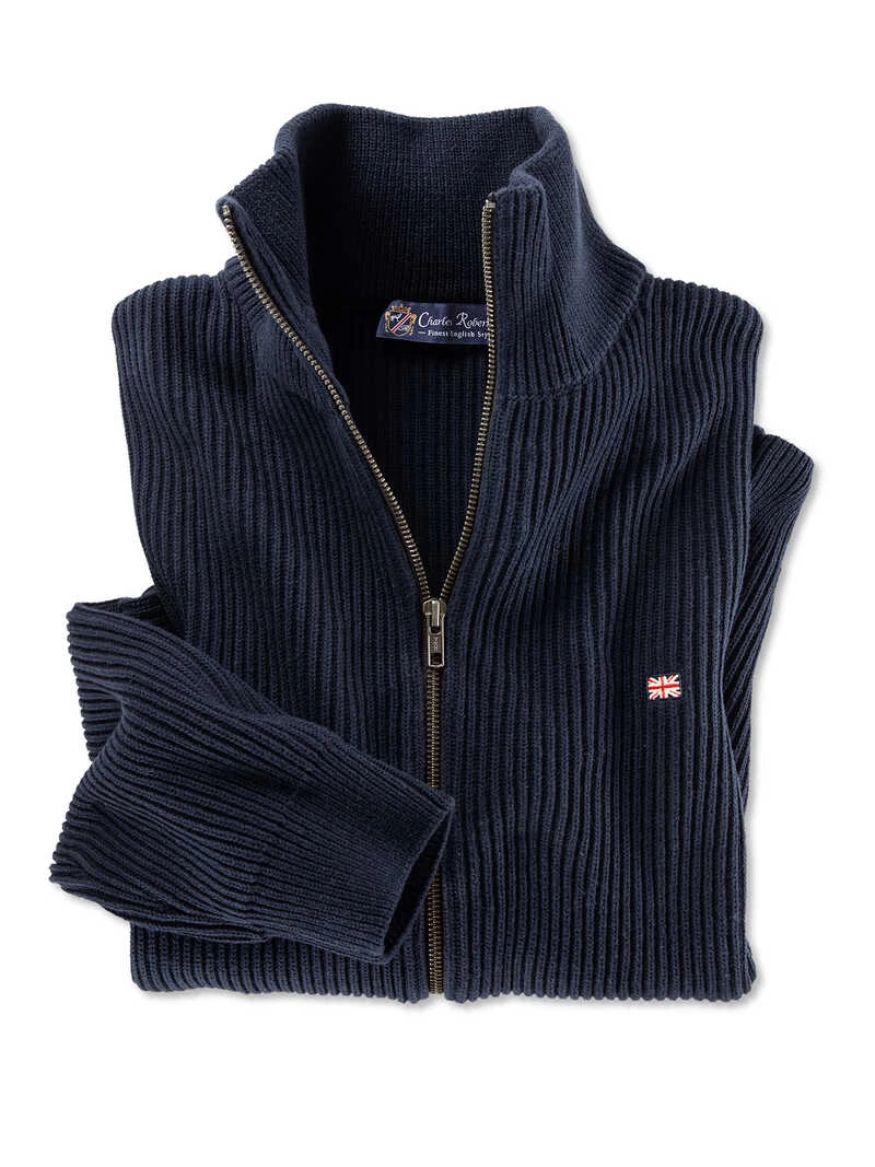 Ein Klassiker mit moderner Note! Dieser Sommer-Cardigan im Patentstrick ist zu einem echten Bestseller avanciert. Der maritime, dunkle Blauton trägt sich zu vielen Anlässen und lässt sich großartig zu Jeans, Chinos und Bermudas kombinieren. Gearbeitet in normaler Passform (Regular Fit) mit Zweiwege-Reißverschluss, Stehkragen und dezent eingesticktem ‚Union Jack‘. Original Charles Robertson.